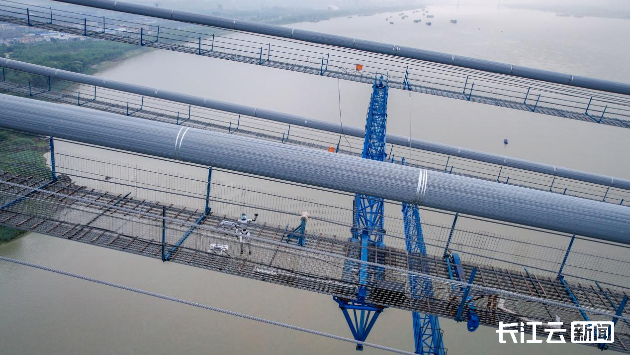 据悉,燕矶长江大桥是世界最大跨径四主缆悬索桥,同时也是世界首座不同垂度四主缆双层钢桁梁悬索桥。全桥四根主缆总长约12公里,所有钢丝长约33万公里,可绕地球赤道8圈,重约6.5万吨,相当于在两塔之间吊起约7座埃菲尔铁塔,是世界上最长、最重的主缆。成桥阶段单根主缆的最大缆力约7万吨,四根主缆总拉力达28万吨,可轻松拉起6艘中型航母,是世界主缆拉力最大的悬索桥。为满足大桥上部结构的施工需要,全桥共建设了四条猫道,单条猫道宽3.45米,长约3公里,总长达到了12公里,相当于绕着操场跑30圈,是世界上最长的猫道。