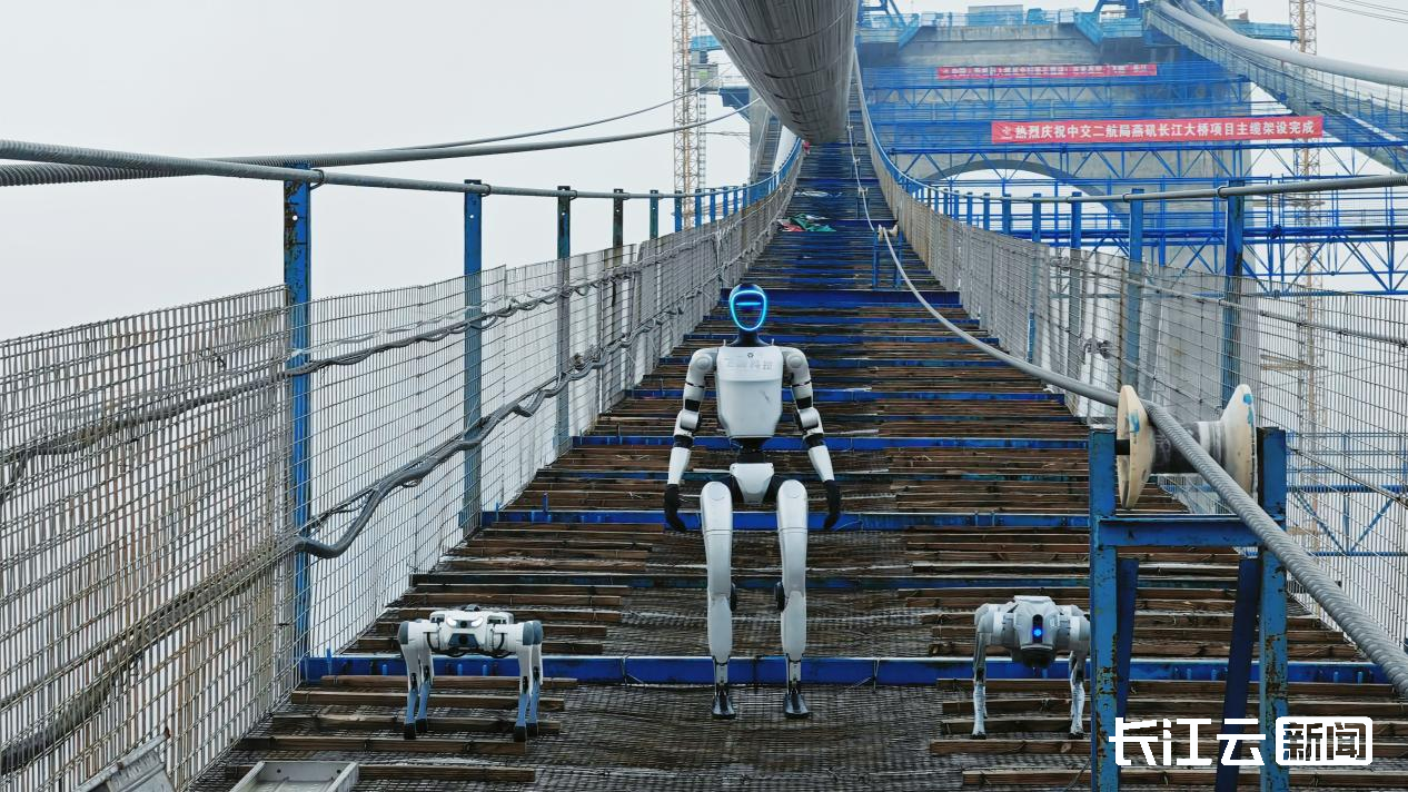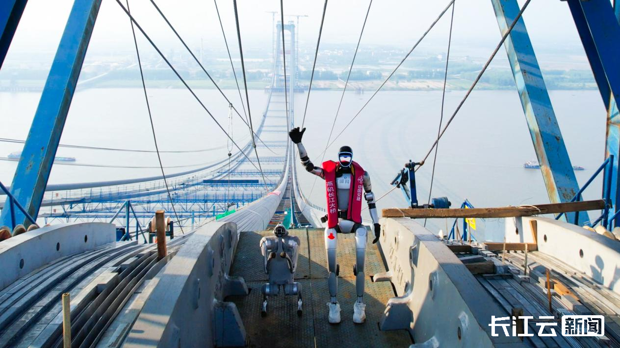两个主塔位居长江两岸,跨越1860米,最高点184米,相当于61层楼高;一条猫道3公里,四条猫道总长达到了12公里,相当于绕着操场跑30圈……中国人形机器人和机器狗在猫道上走“猫步”,会是一种怎样的“穿云破雾”的感受?