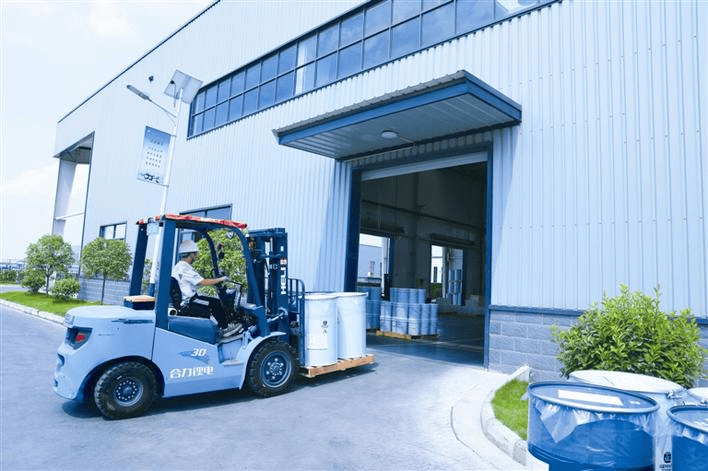 在湖北正安新材料高性能特种硅材料项目一期,工人用叉车运输液体硅橡胶。(图片来源:三峡日报、猇亭融媒)