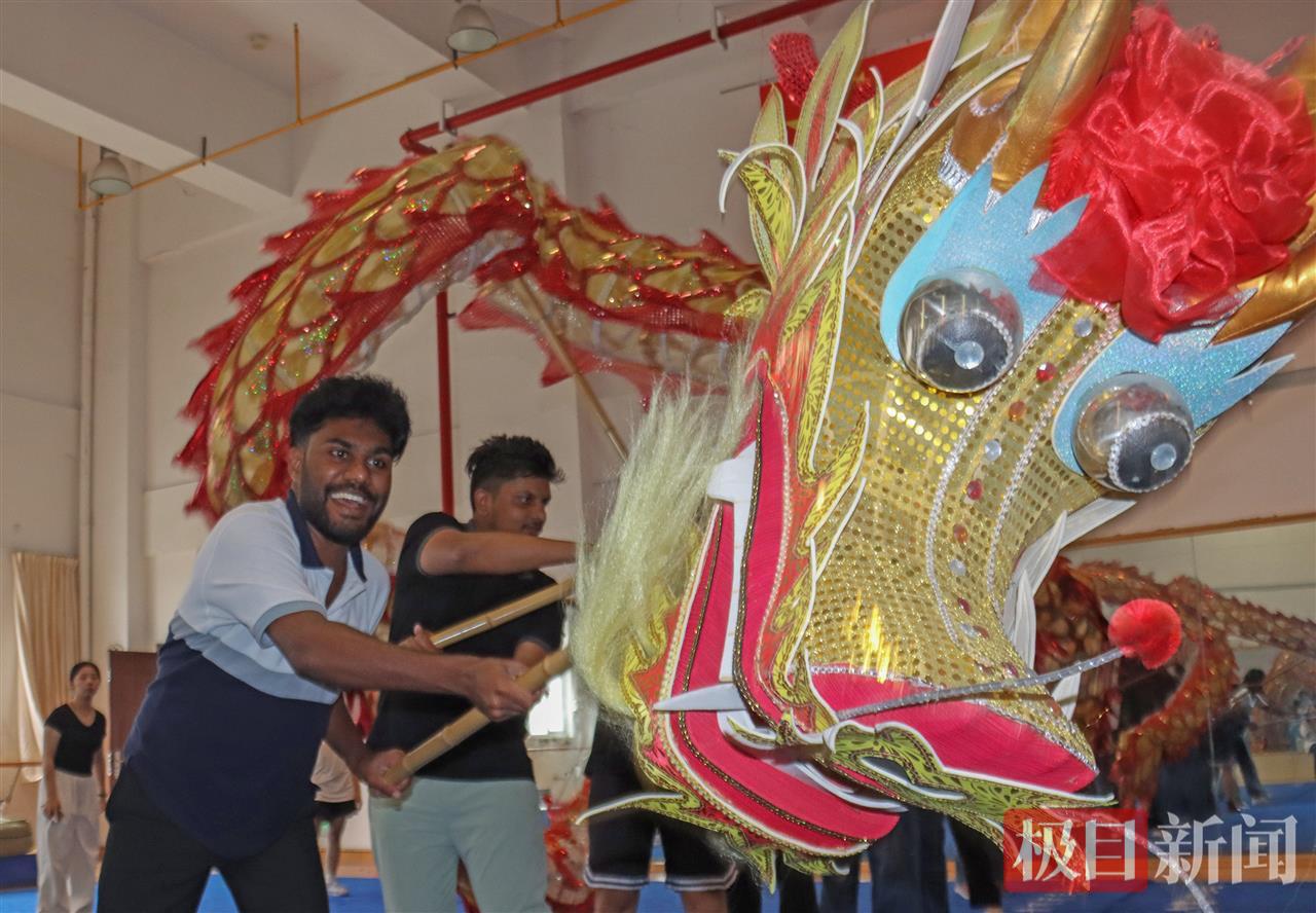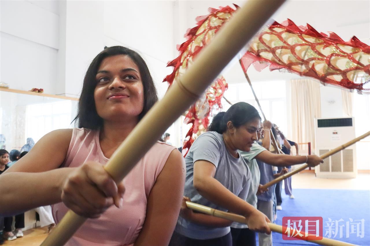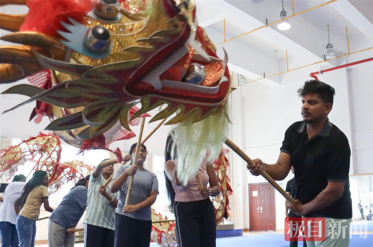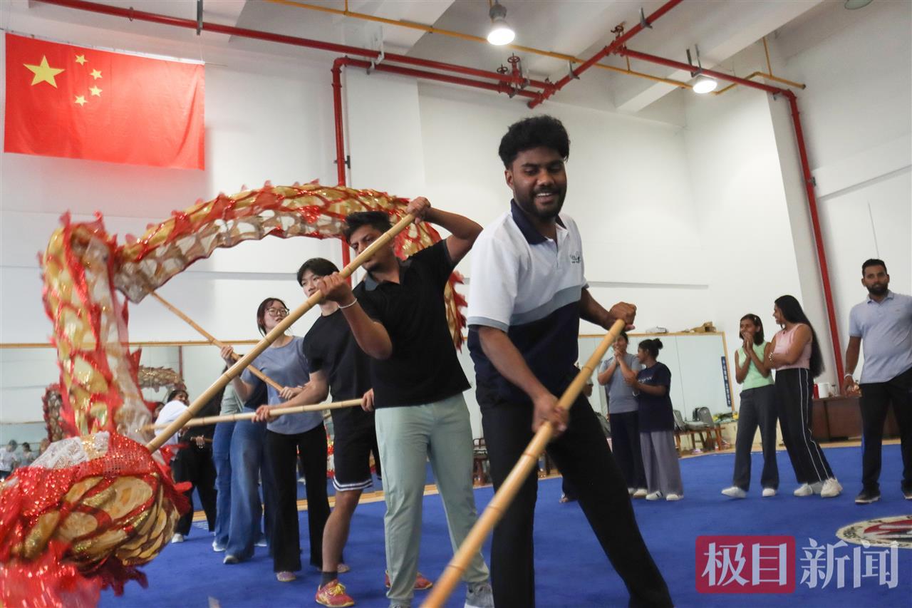 6月11日,湖北黄冈师范学院体育馆,斯里兰卡学生和中国学生共舞中国龙。在铿锵的鼓点中,学生们手握竹竿,左右挥舞,一条活灵活现的龙欢快游动。