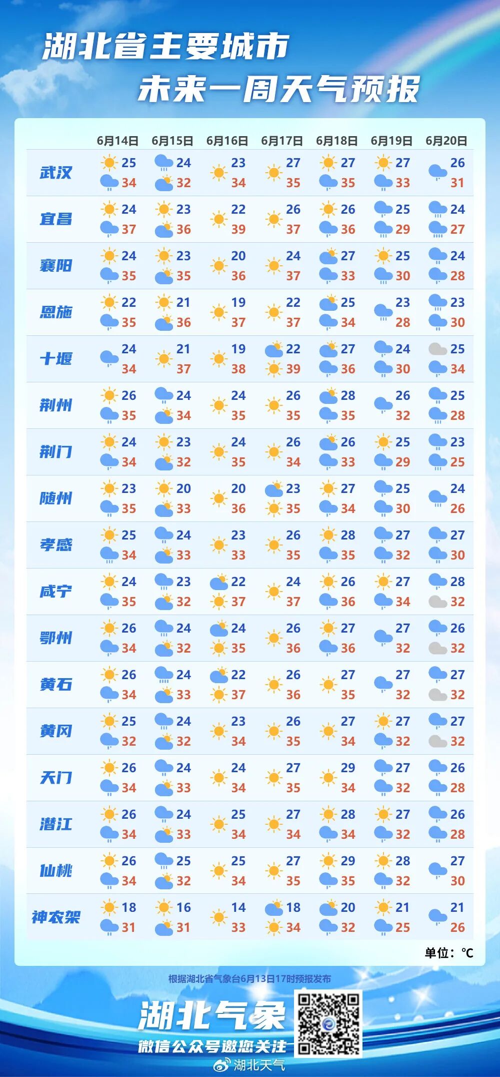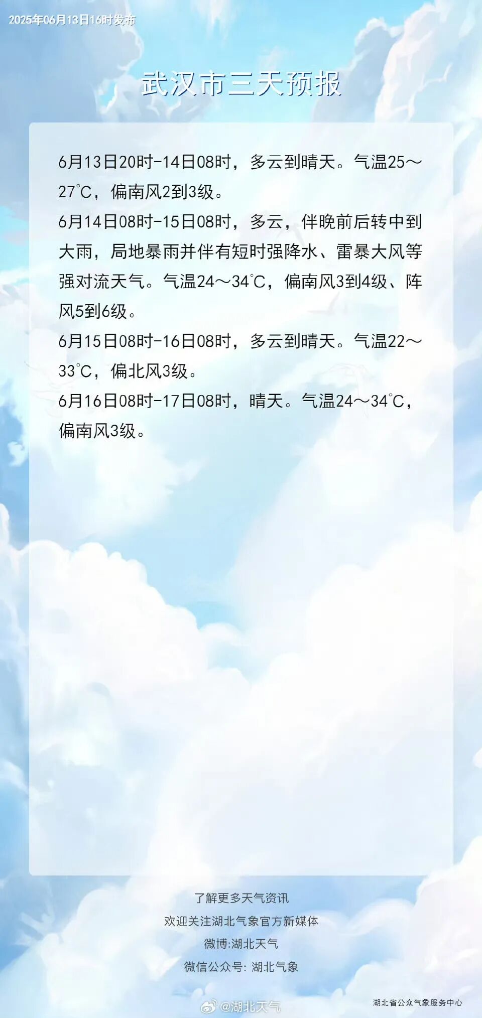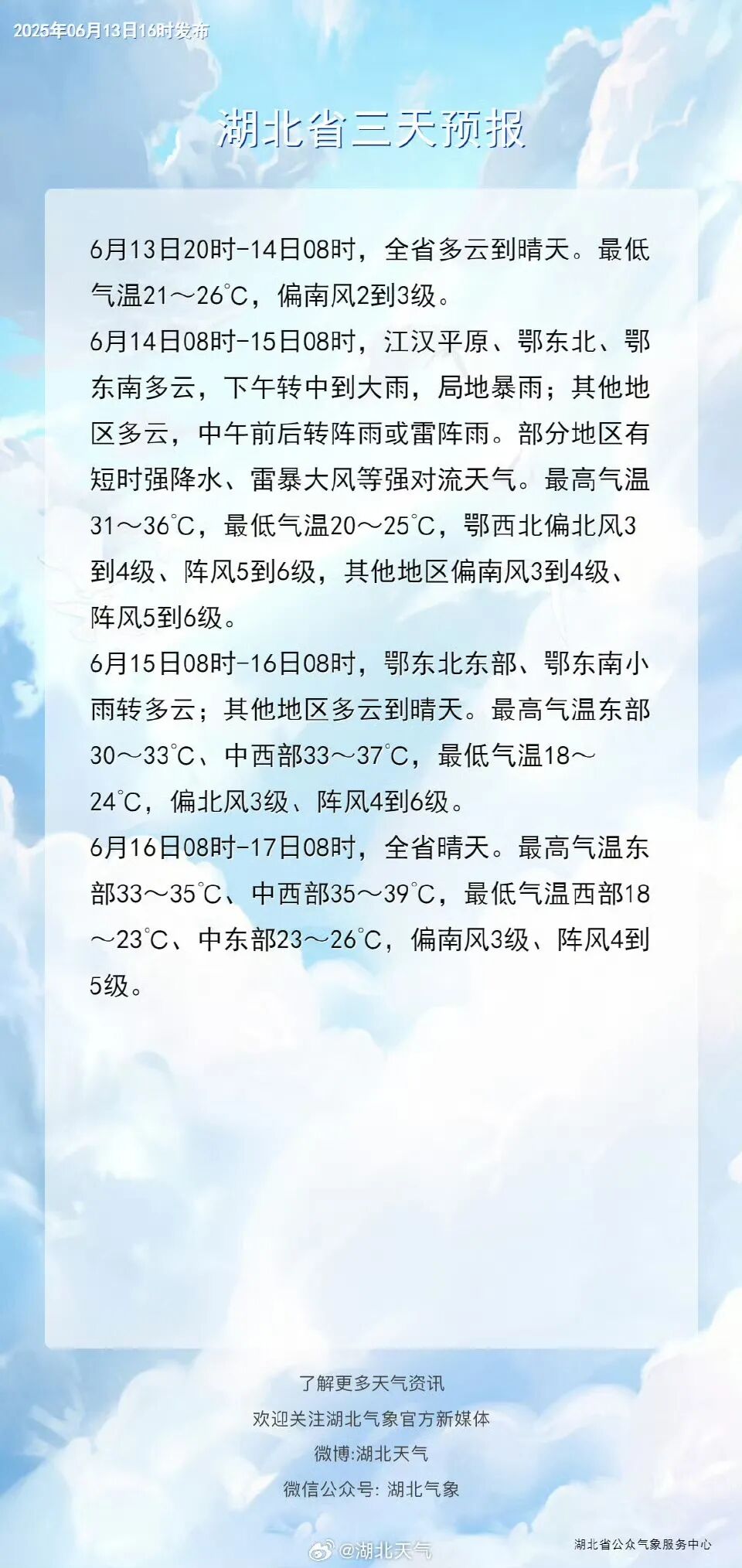 天气趋势 预计今晚全省维持多云到晴天 明天(周六)受台风外围云系影响 午后至晚上 江汉平原和我省东部 会有中到大雨出现 其中荆州东部、咸宁、黄冈等地 或将出现单点暴雨 局地还会伴有短时强降水、雷暴大风 等强对流天气 省内其他地区有阵雨或雷阵雨 不过,降雨持续时间不长 后天(周日)仅东部部分地区 还会有小雨残留 省内其他地区转为多云到晴 6月16日(下周一)全省转为晴天 气温上升明显 东部最高气温33~35℃ 中西部最高气温可达35~39℃ 遭遇强对流天气 如何应对? 台风“蝴蝶”即将登陆 湖北又迎降雨 请大家注意防范!