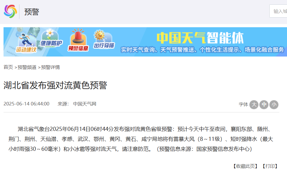 湖北省气象台2025年06月14日06时44分发布强对流黄色省级预警: