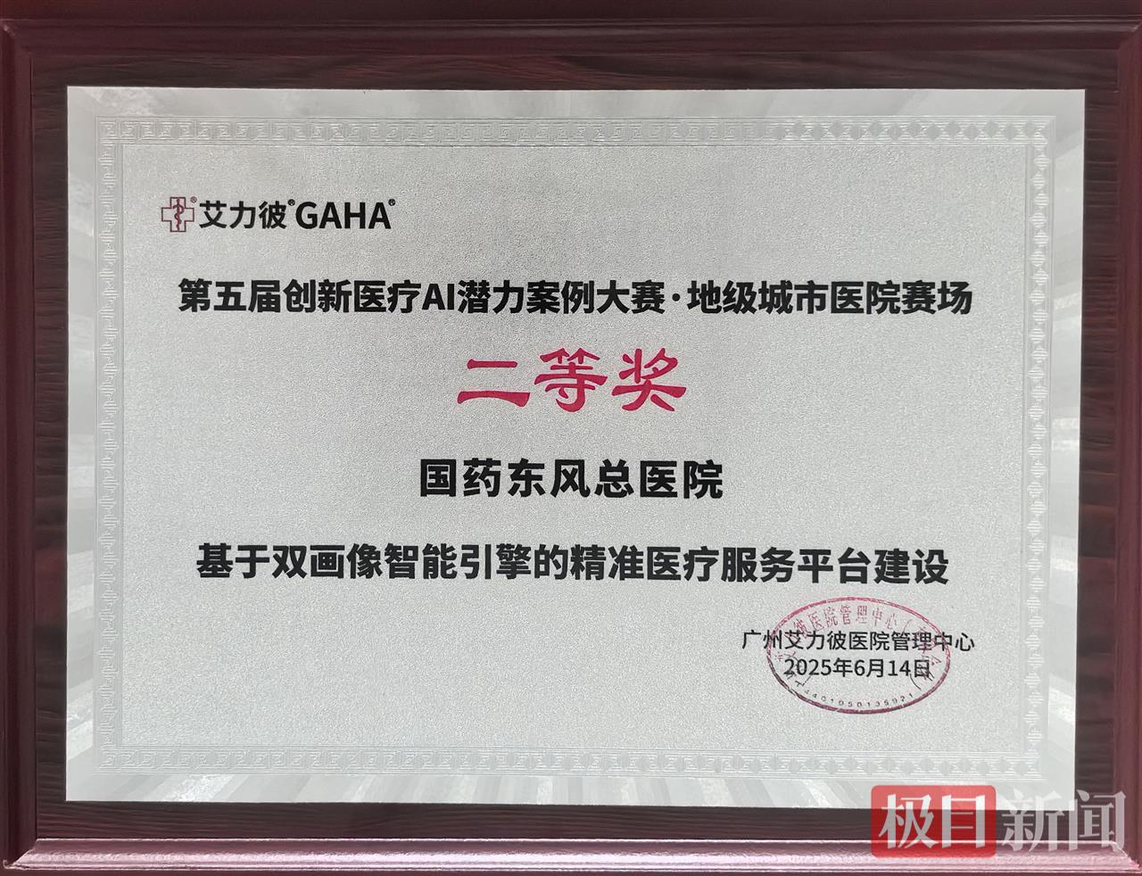 近日,由艾力彼医院管理研究中心主办的“2025中国医院创新力大会”暨第五届创新医疗AI潜力案例大赛在广州圆满落幕。国药东风总医院申报的《基于双画像智能引擎的精准医疗服务平台建设》项目,从全国600 多个优秀案例中脱颖而出,历经层层选拔入围总决赛,最终凭借其创新的技术理念与显著的应用价值,荣获全国总决赛二等奖!