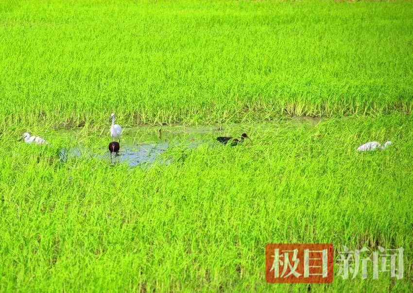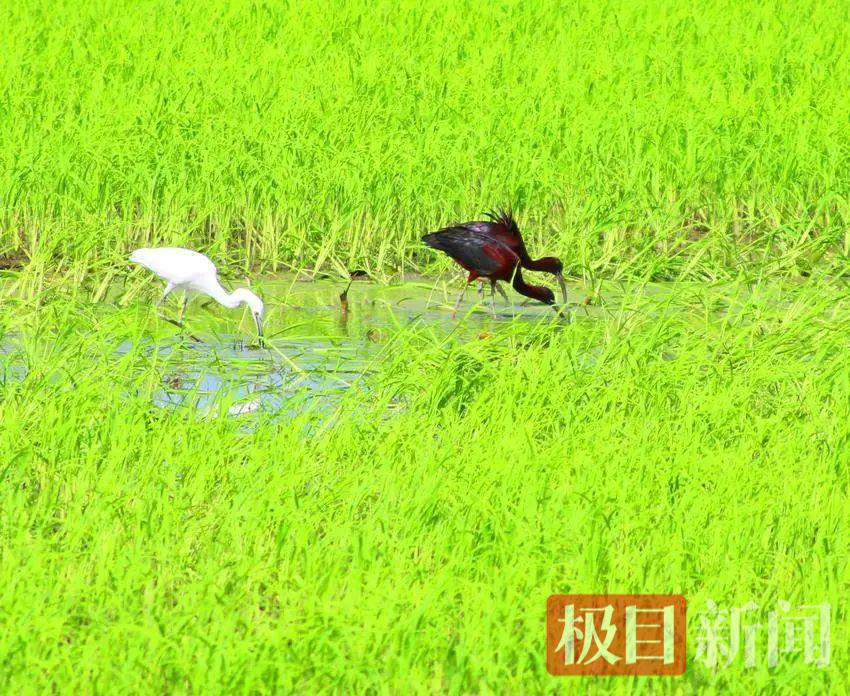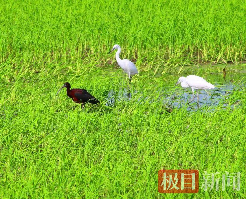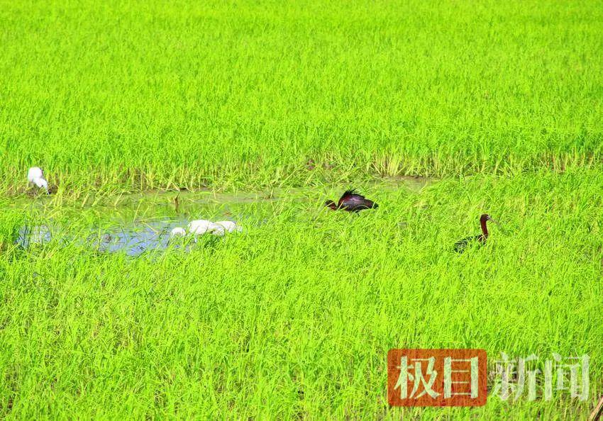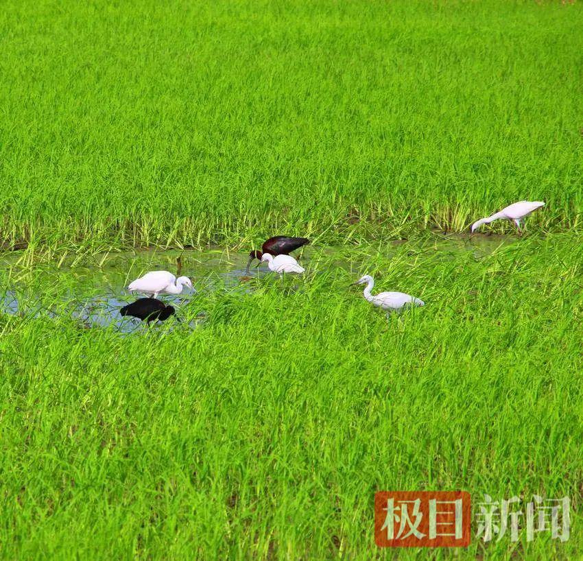 6月16日,初夏的湖北省孝感市朱湖国家湿地公园,翠绿的稻浪随风起伏,4只羽毛泛着青铜栗色金属光泽的国家一级重点保护动物彩鹮悠然立于田间。它们时而低头觅食,时而振翅低飞,羽翼在阳光下折射出蓝绿变幻的虹彩,宛如“湿地彩虹”翩跹起舞。