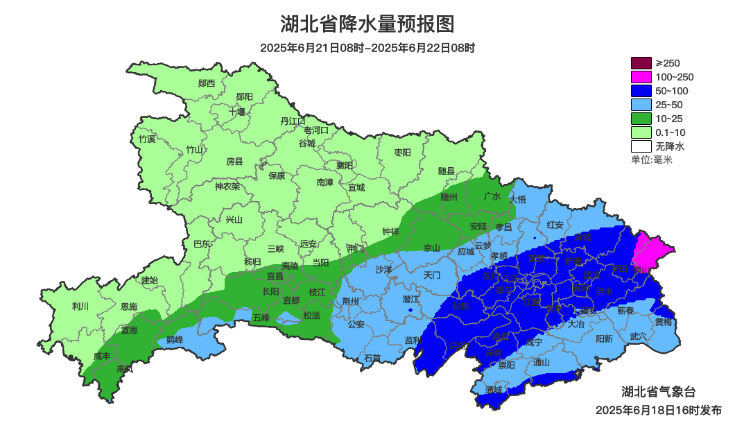 6月21日08时-22日08时,江汉平原、鄂东北、鄂东南阴天有大雨到暴雨,局地大暴雨;其他地区阴天有小到中雨,局地大雨。省内部分地区伴有短时强降水,局地有雷暴大风。最高气温鄂东南29~32℃、其他地区24~28℃,最低气温19~23℃,偏北风3级、阵风4到6级。