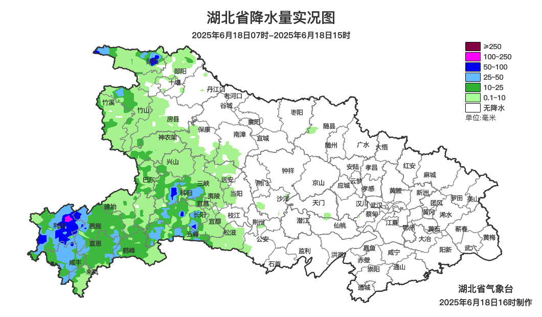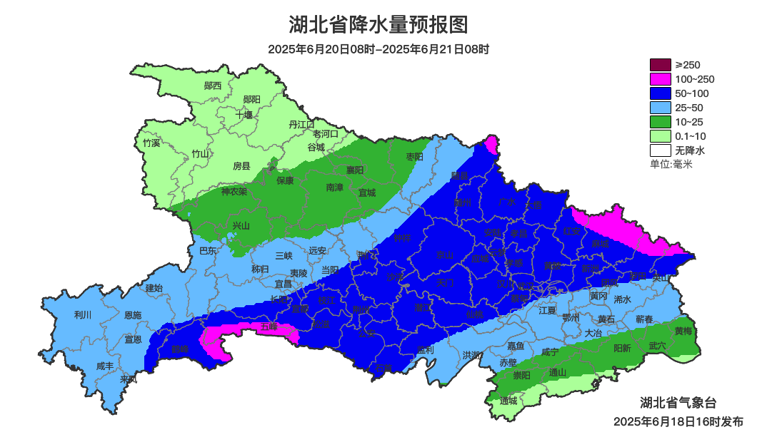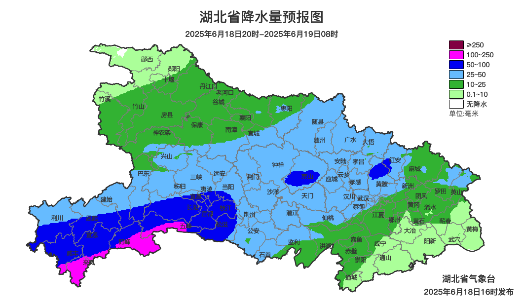 预计今晚较强降雨仍主要集中在鄂西南,有大到暴雨,局地大暴雨。明天,强降雨的范围将明显扩大,鄂西北东部、鄂西南、江汉平原、鄂东北阴天有大到暴雨,局地大暴雨,其他地区有中到大雨,局地暴雨。20至21日,强降雨中心将逐渐东移南压,强降雨区会有大到暴雨,局地大暴雨出现。