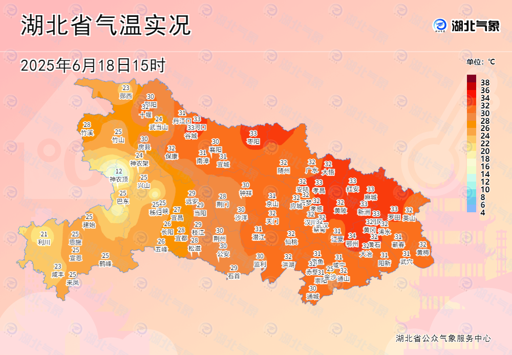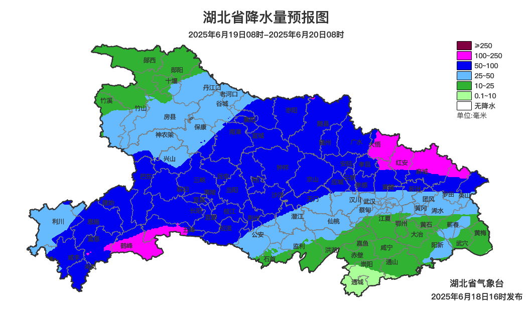 6月19日08时-20日08时,鄂西北东部、鄂西南、江汉平原、鄂东北阴天有大雨到暴雨,局地大暴雨;其他地区阴天有中到大雨,局地暴雨。省内部分地区伴有短时强降水,局地有雷暴大风。最高气温恩施地区23~25℃、其他地区25~30℃,最低气温恩施地区21~23℃、其他地区23~25℃,偏南风3到5级、阵风6到8级。