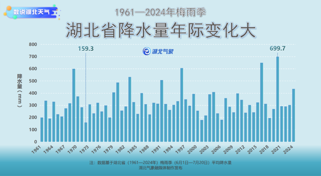 每年,梅雨除了长短存在很大差异外,强弱也存在不同的年际变化。从湖北1961—2024年逐年梅雨季(6月1日—7月20日)降水量变化来看,1972年梅雨季降水量最少,仅159.3毫米,较常年同期偏少177.7毫米(常年337毫米),而2020年则出现699.7毫米的“暴力梅”,2016年降水量也达到650.5毫米。同时,有些年份梅雨也不走寻常路,可能出现枯梅、空梅、二度梅、倒黄梅等异常梅雨。