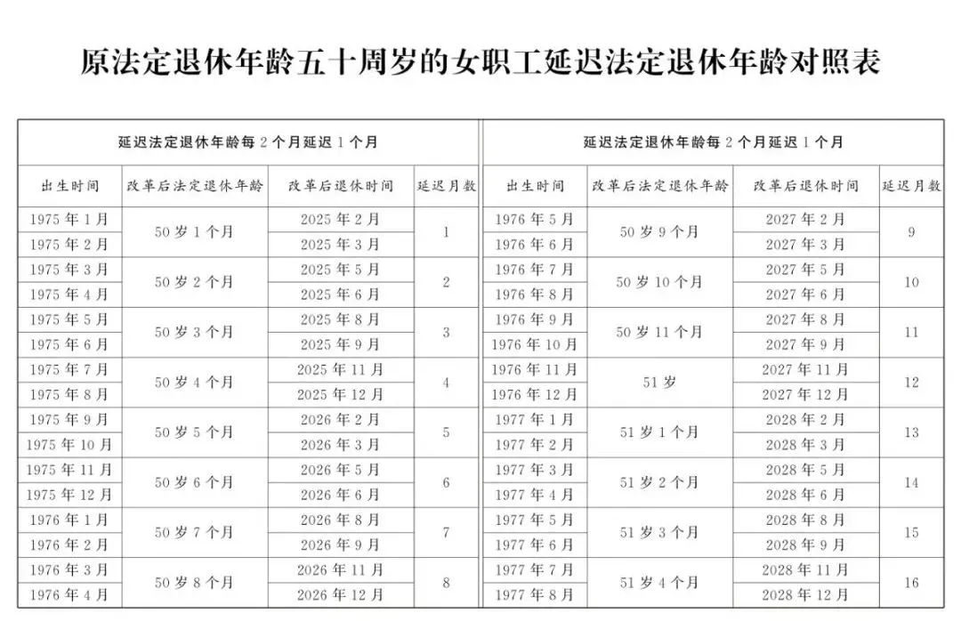 从2025年1月1日起,原法定退休年龄为五十周岁的女职工,法定退休年龄每二个月延迟一个月,逐步延迟至五十五周岁。