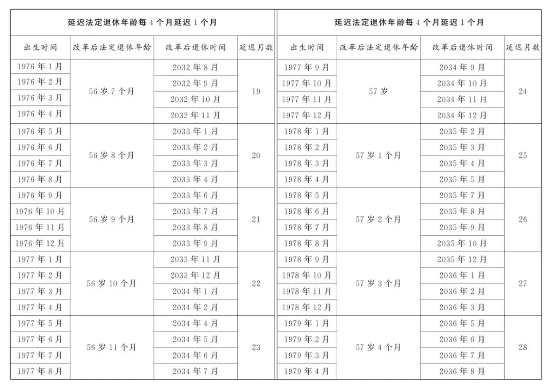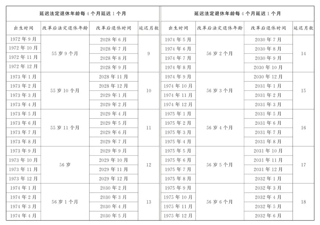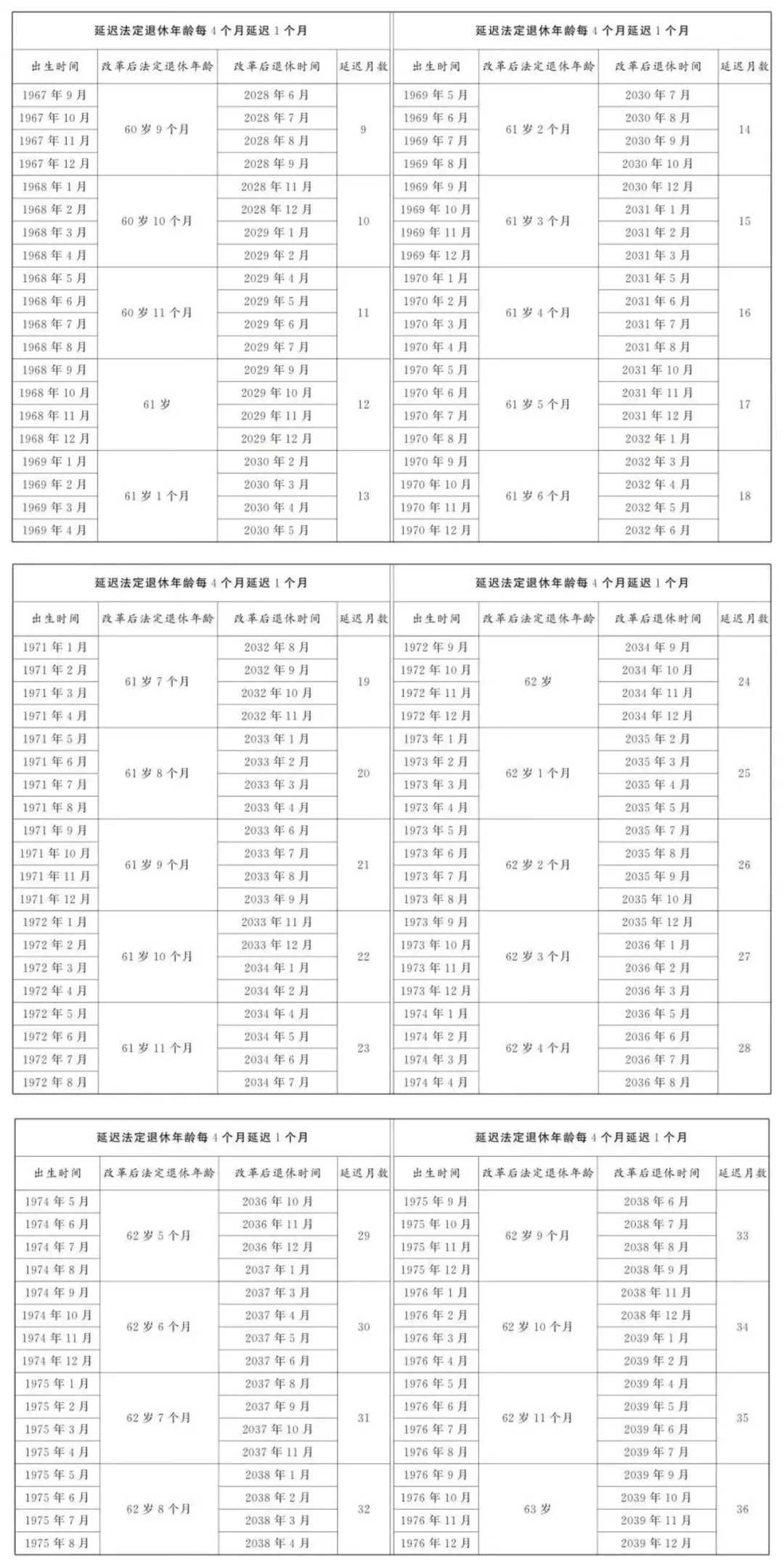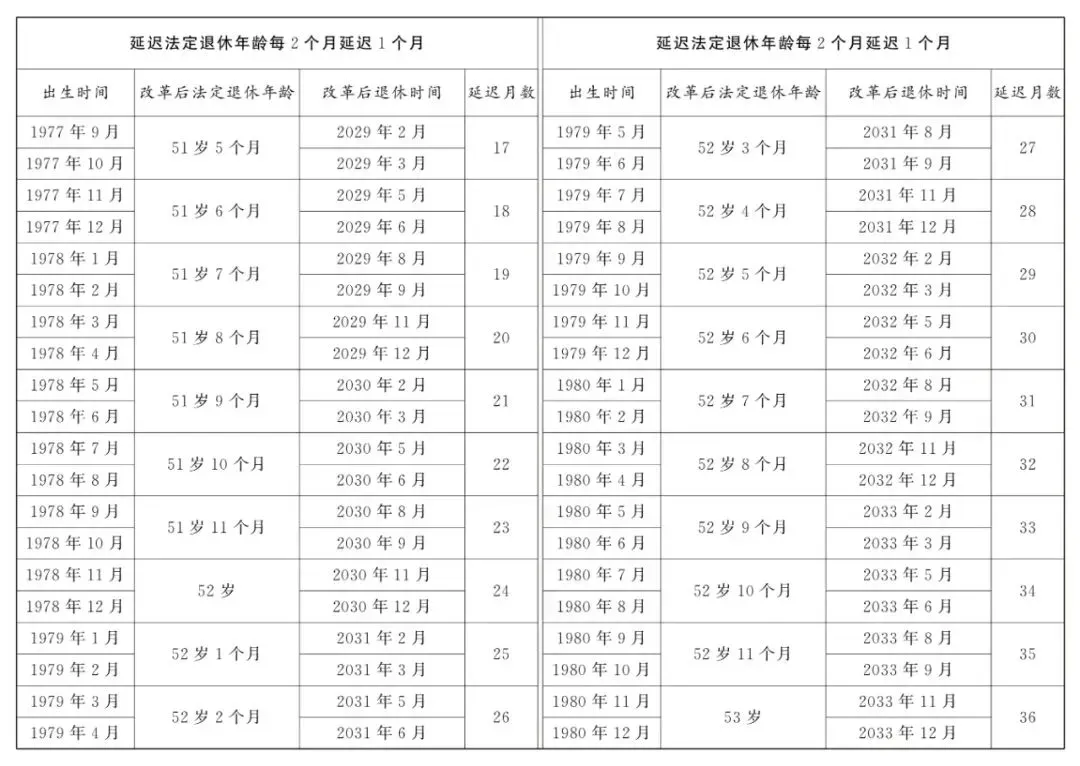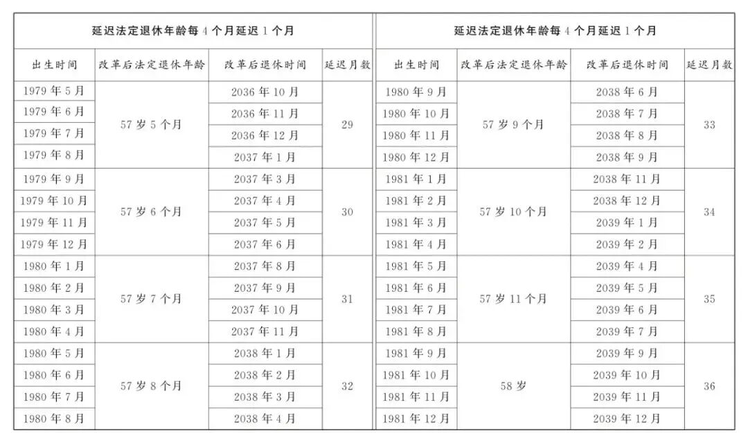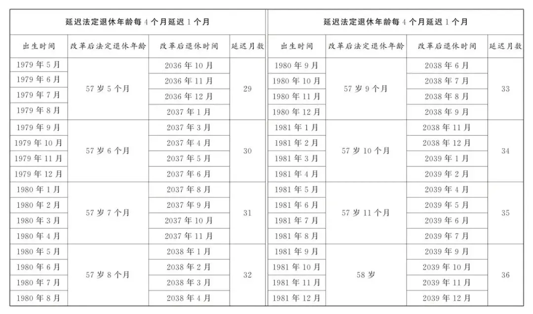 2024年9月13日第十四届全国人民代表大会常务委员会第十一次会议通过《关于实施渐进式延迟法定退休年龄的决定》,自2025年1月1日起施行。据北京发布消息,根据《国务院关于渐进式延迟法定退休年龄的办法》,自2025年起执行退休年龄新规定,即:
