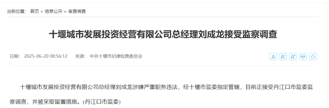 据十堰市纪委监委网站6月20日消息:十堰城市发展投资经营有限公司总经理刘成龙涉嫌严重职务违法,经十堰市监委指定管辖,目前正接受丹江口市监委监察调查,并被采取留置措施。
