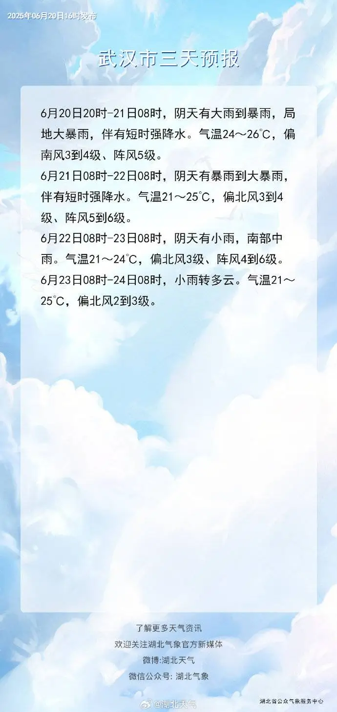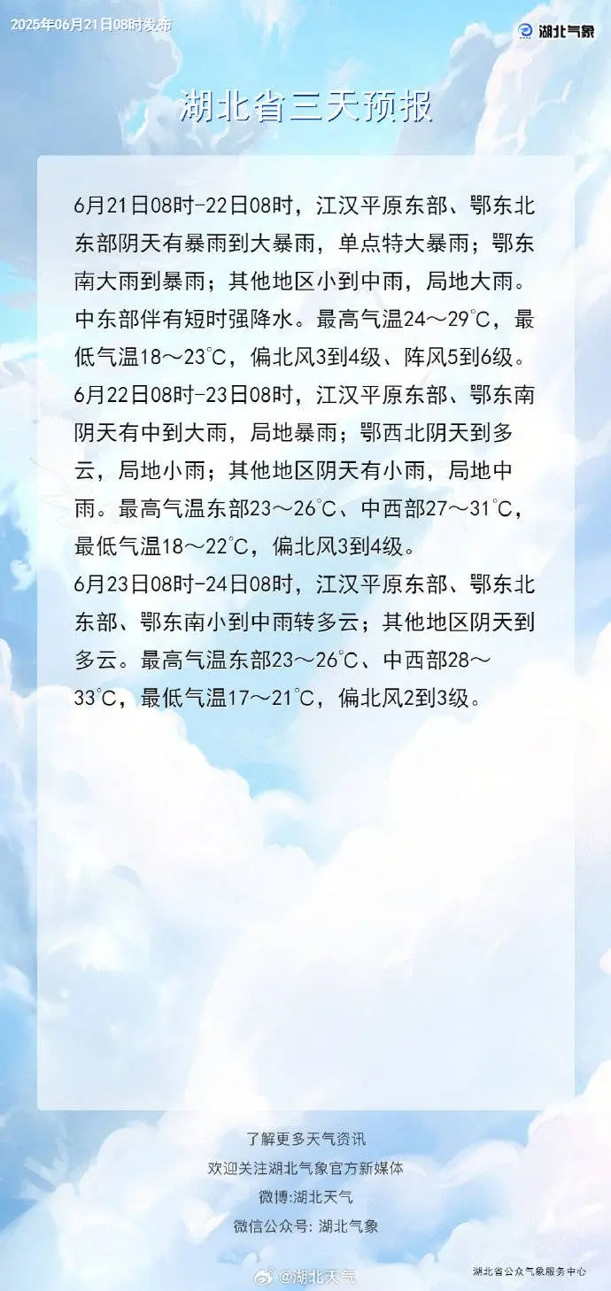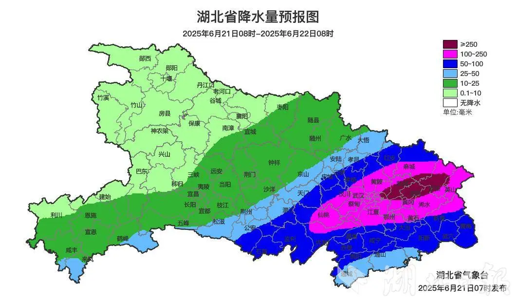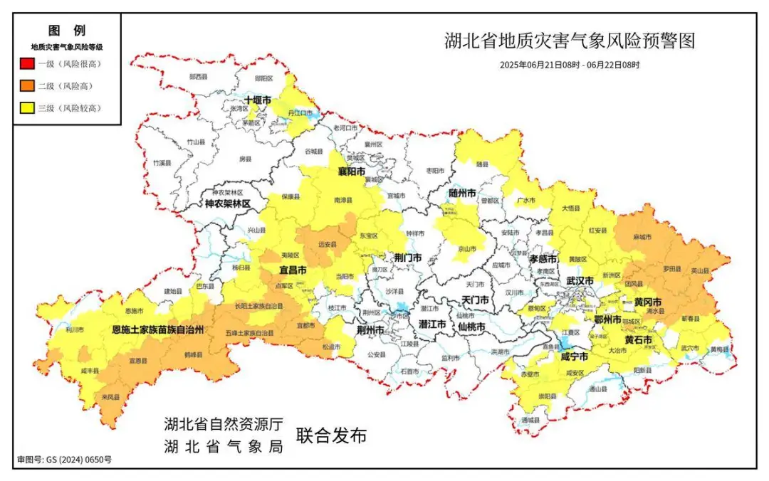 2025年6月21日08时-2025年6月22日08时,预计三峡库区(兴山县东部、秭归县中部和东部、夷陵区),宜昌地区大部、恩施地区大部、鄂州市、黄冈地区,十堰市(茅箭区北部、张湾区东北部、郧阳区东北部、丹江口市)、襄阳市(谷城县东南部、保康县南部和东部、南漳县、宜城市西部)、荆州市(松滋市)、荆门市(东宝区、漳河新区、钟祥市西部和东北部、京山市北部和中部)、随州市(随县、广水市、大洪山风景名胜区)、孝感市(孝昌县东部、大悟县)、武汉市(洪山区局部、青山区局部、武昌区局部、黄陂区北部和东部、新洲区、蔡甸区中西部、江夏区中北部)、黄石市(黄石港区、铁山区、下陆区、西塞山区、开发区、大冶市、阳新县北部)、咸宁市(咸安区、赤壁市、嘉鱼县中部、崇阳县西部和中部) 以及其他强降水区域发生崩塌、滑坡、泥石流的风险较高;