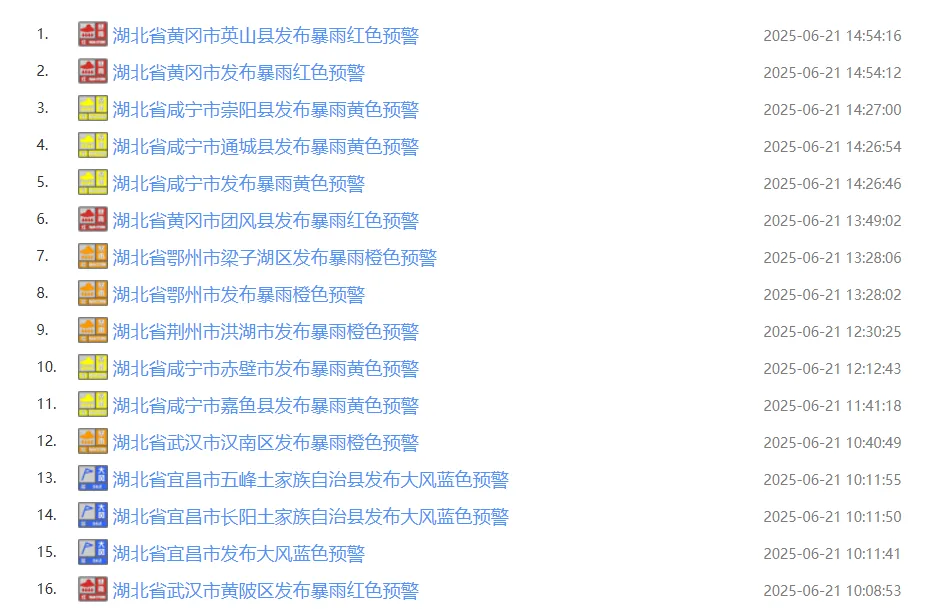 6月21日,省自然资源厅和省气象局联合发布湖北省地质灾害橙色预警和黄色预警。