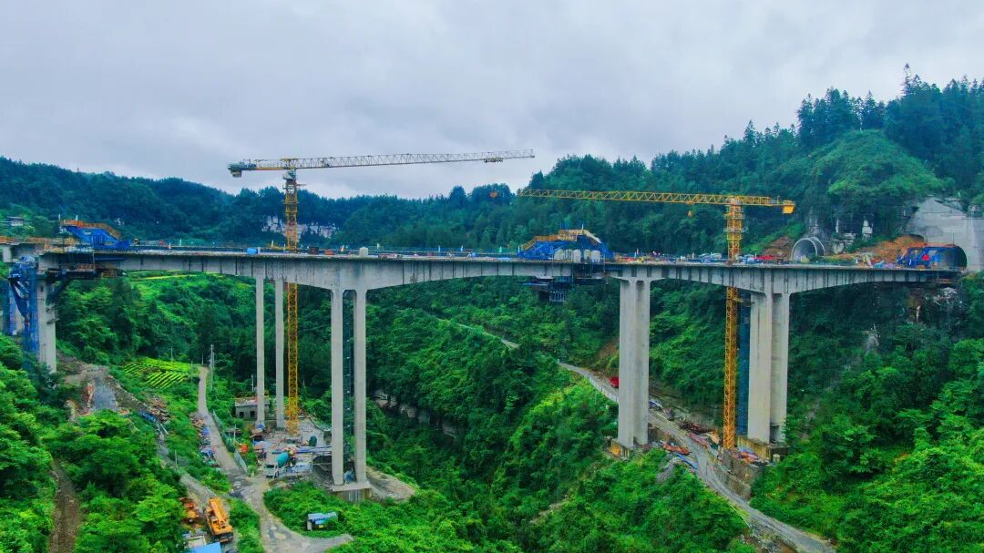 两洞桥大桥横跨在“V”型大峡谷之上,峡谷上下高差近百米,两侧主墩均位于悬崖峭壁之上。为确保大桥能顺利“站起来”,项目建设团队在半山腰的绝壁上开凿出作业面,成功解决了主墩下部结构缺乏施工场地的难题。