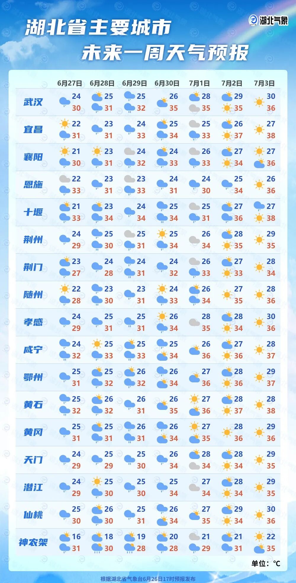 天气预报 6月27日20时——6月28日08时,江汉平原东部、鄂东北、鄂东南阴天有阵雨或雷阵雨,局地大雨或暴雨;其他地区多云,局地有阵雨或雷阵雨。省内局地伴有短时强降水、雷暴大风等强对流天气。最低气温21~26℃,偏南风3到4级、阵风5到6级。 6月28日08时——6月29日08时,鄂西北东部、江汉平原、鄂东北阴天有分散性大雨到暴雨;其他地区多云有阵雨或雷阵雨。省内局地伴有短时强降水、雷暴大风等强对流天气。最高气温鄂西北、鄂东南32~35℃、其他地区29~32℃,最低气温21~26℃,偏南风3到4级、阵风5到7级。 6月29日08时——6月30日08时,全省多云有阵雨或雷阵雨,其中江汉平原、鄂东北有中到大雨,局地暴雨。省内局地伴有短时强降水、雷暴大风等强对流天气。最高气温西部32~35℃、中东部28~32℃,最低气温22~26℃,偏南风3到4级、阵风5到7级。 6月30日08时——7月1日08时,鄂西北、鄂西南多云有阵雨或雷阵雨,局地伴有短时强降水、雷暴大风等强对流天气;其他地区多云,午后局地有阵雨或雷阵雨。最高气温西部29~33℃、中东部33~36℃,最低气温西部23~26℃、中东部26~29℃,偏南风3到4级、阵风5到6级。 防灾减灾科普之洪水来袭如何自救 受到洪水威胁,如果时间充裕应按照预定路线,有组织地向山坡、高地等处转移。 在已经受到洪水包围的情况下,要尽可能利用船只、木排、门板、木床等物品进行水上转移。 若洪水来得太快,已来不及转移时,可以爬上屋顶、楼房高屋、大树、高墙,做暂时避险,等待援救,尽量不要独自游水转移。 在山区,如果连降暴雨容易暴发山洪,遇到这种情况,应注意避免渡河,以防止被山洪冲走,还要注意防止山体滑坡、滚石、泥石流的伤害。 发现高压线铁塔倾倒、电线低垂或断折时,要远离避险,不可触摸或接近,防止触电。