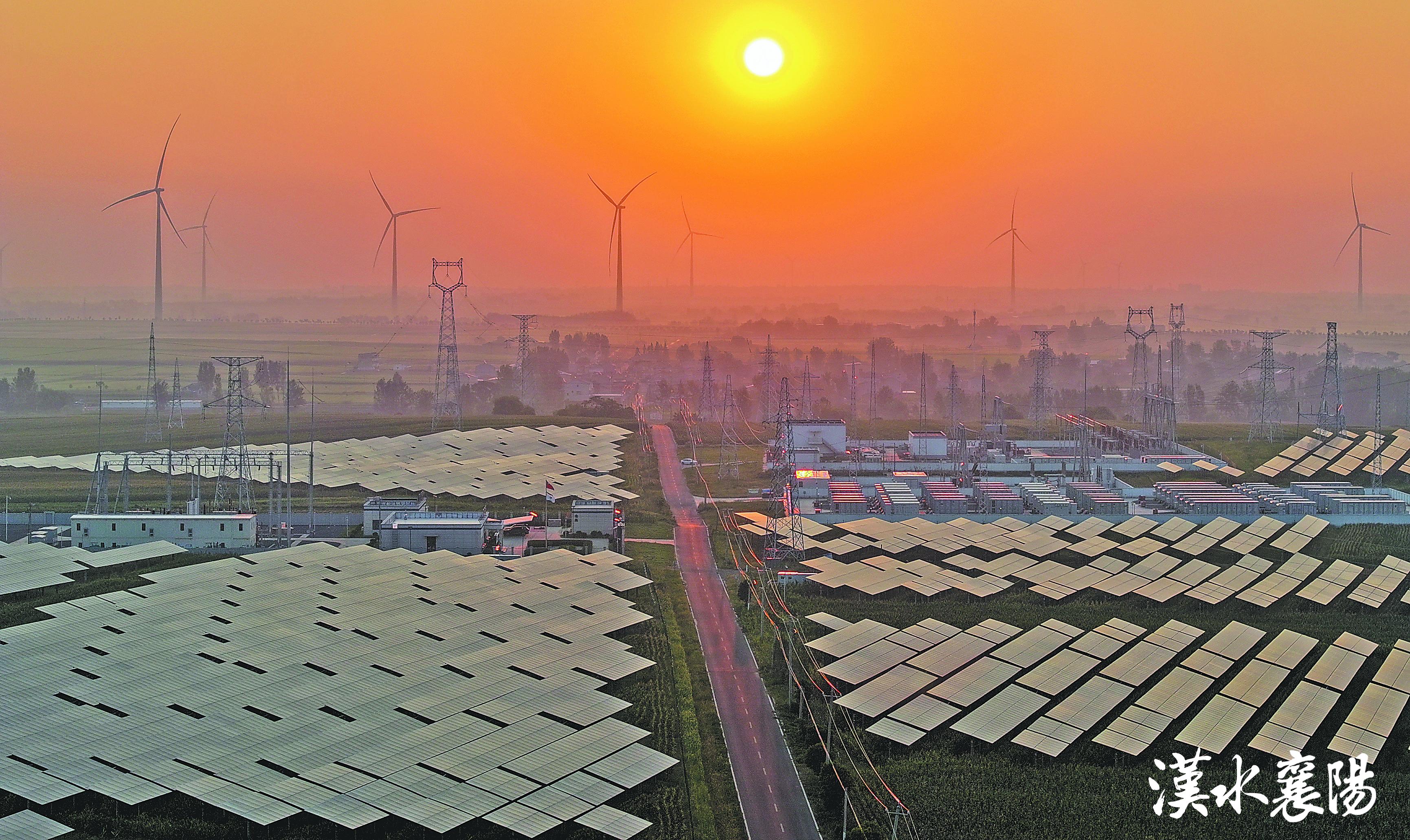 位于襄州区黄集镇的风力发电机叶片在晨曦中迎风旋转,与光伏电站、储能站交相辉映。