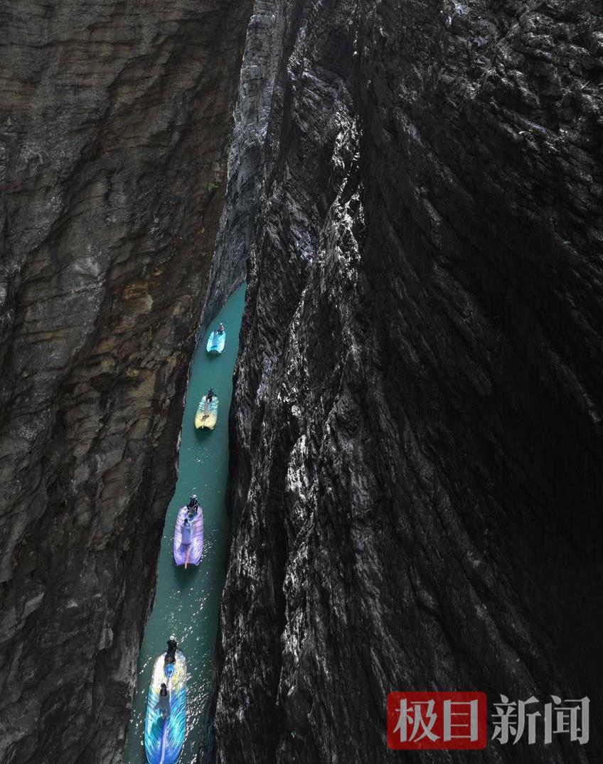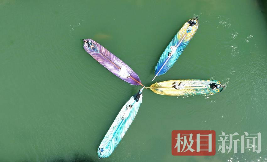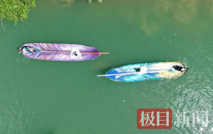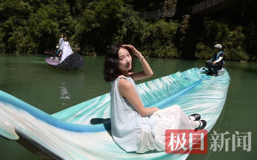 7月3日,游客在湖北省恩施州鹤峰县屏山景区乘坐羽毛船。去年以来,当地以生态理念为引领,打造仿生箬叶船、羽毛船艺术景观。这批融合地域特色的轻舟亮相屏山景区后,吸引了众多游客。