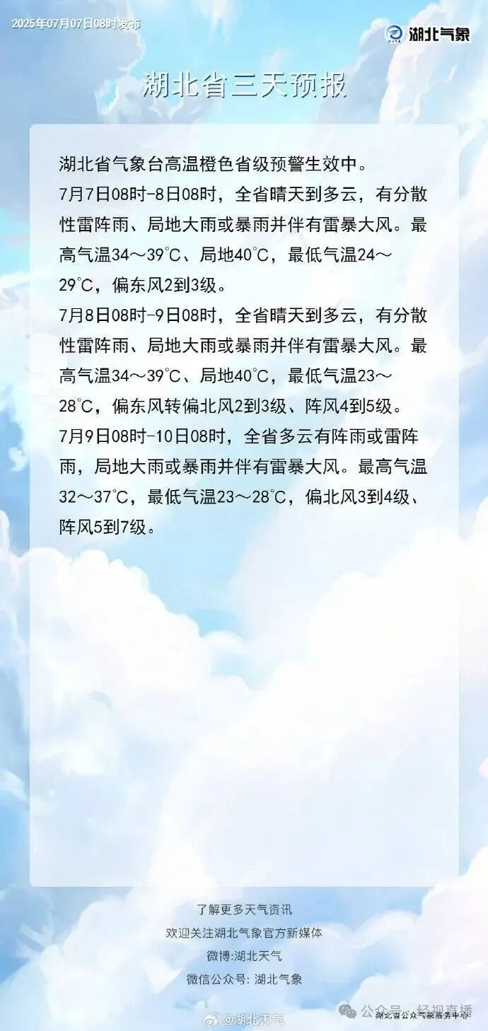 据湖北省气象局7日消息,预计今天白天,除西部高山地区外,我省大部分地区最高气温将升至37℃以上,其中襄阳、随州、武汉、鄂州、黄冈、黄石、咸宁等局地可达40℃以上。明天高温热浪持续。另外,今明天省内多分散性雷阵雨、局地大雨或暴雨并伴有雷暴大风。