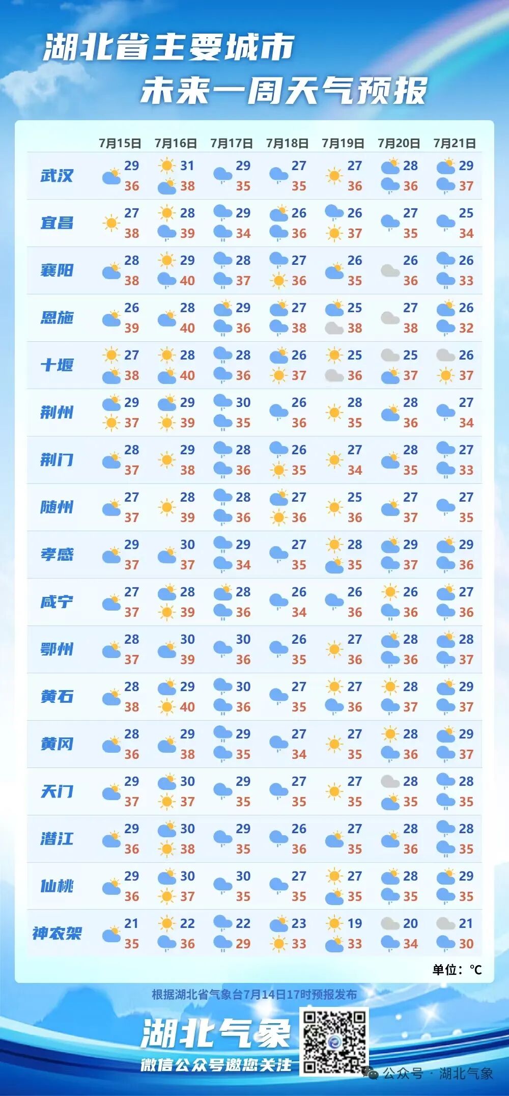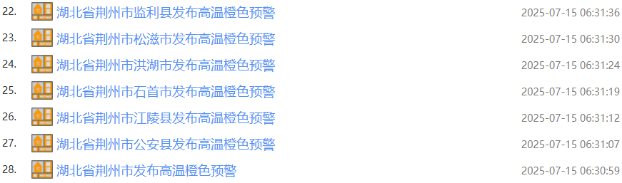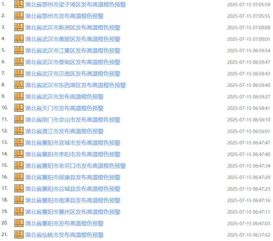 今晨(7月15日),湖北连发28条高温橙色预警,涉武汉、鄂州、襄阳、荆门、荆州等地。