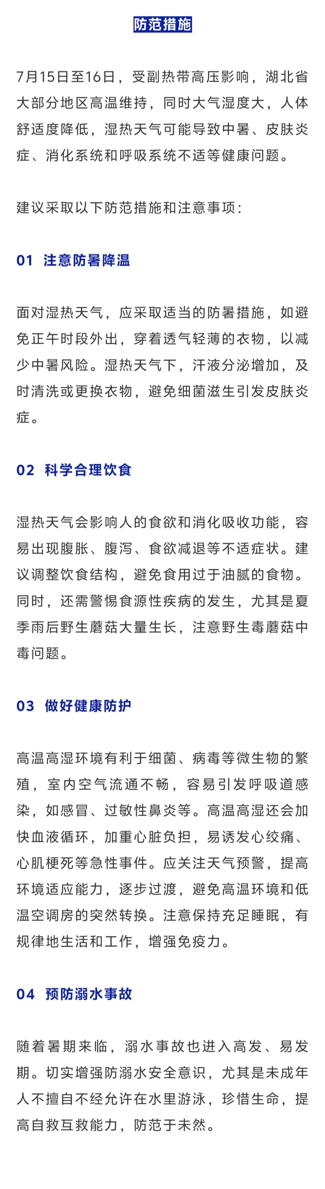 根据湖北省高温中暑指数预报,15日至16日高风险区进一步扩大,除鄂西西部和鄂东东部高海拔地区外,全省大部处于高温中暑较高至高风险区。