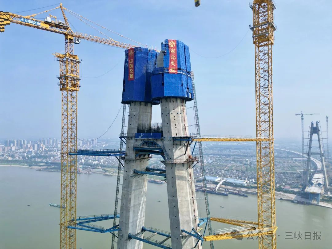 枝江长江大桥全长1549米,主跨890米,连接枝江市区和百里洲镇。是目前在建的世界最大跨径-UHPC组合梁斜拉桥。大桥北岸主塔高241米,已于今年3月21日封顶,此次封顶的大桥南岸主塔高257.5米,约86层楼高,建设过程极为不易。