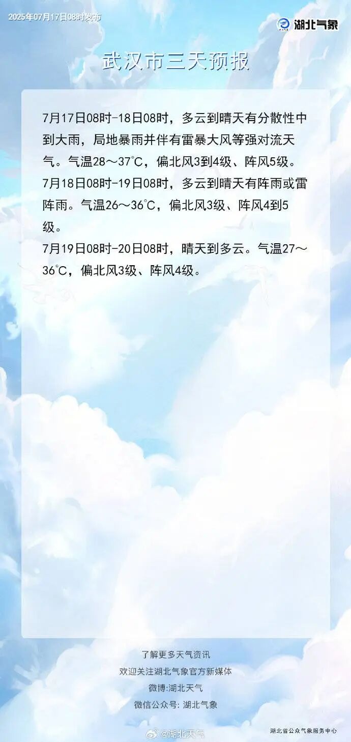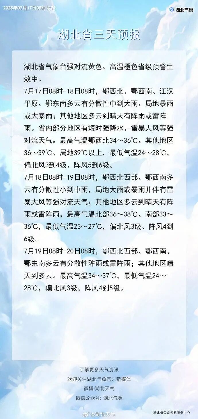 据湖北省气象局17日消息,预计今明两天,我省有分散性降雨和局地强对流,其中西部和南部有分散性中到大雨,局地暴雨或大暴雨。受降雨影响,今天鄂西北高温强度明显减弱,最高气温降至34~36℃,省内其他地区最高气温也会略有减弱,降至36~39℃,局地39℃以上。