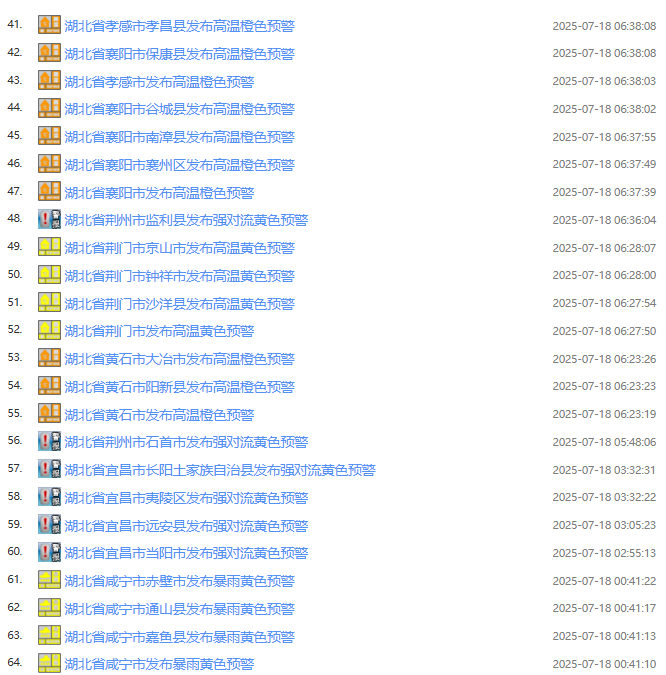 鄂州市气象台2025年07月18日07时10分发布高温橙色预警信号:预计今天白天,鄂州市大部分乡镇(街道)最高气温将升至37℃以上,请注意防范。