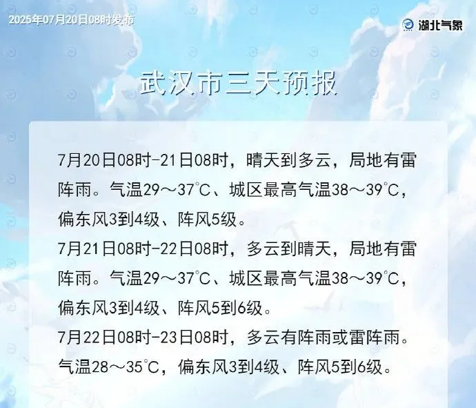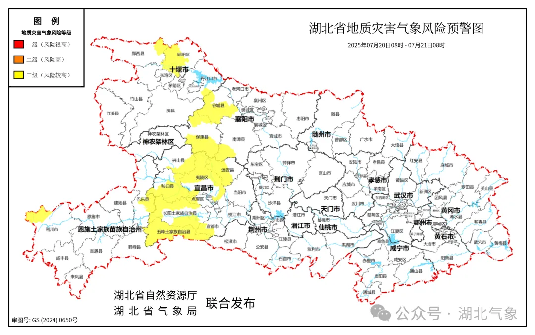 2025年7月20日8时-2025年7月21日8时,预计三峡库区(巴东县中部、兴山县东南部、秭归县南部和东部、夷陵区大部),十堰(张湾区东北部、郧阳区中部和西北部、郧西县东北部、丹江口市东南部)、襄阳(谷城县西部和南部、保康县北部和南部、南漳县西南部)、宜昌(点军区、远安县西部和南部、长阳土家族自治县大部、五峰土家族自治县、宜都市西南部)、恩施(利川市西北部),以及其他强降水区域发生崩塌、滑坡、泥石流的风险较高,请注意防范。