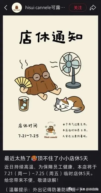 经视直播记者发现,近期,也有不少店铺表示因天气太热要放假。武汉市二中附近的一家蛋糕店,在7月19日也贴出公告:因天气太热,为保障员工健康,从7月21日到7月25日放假。公告采用了漫画形式展示,也吸引了不少网友打趣。