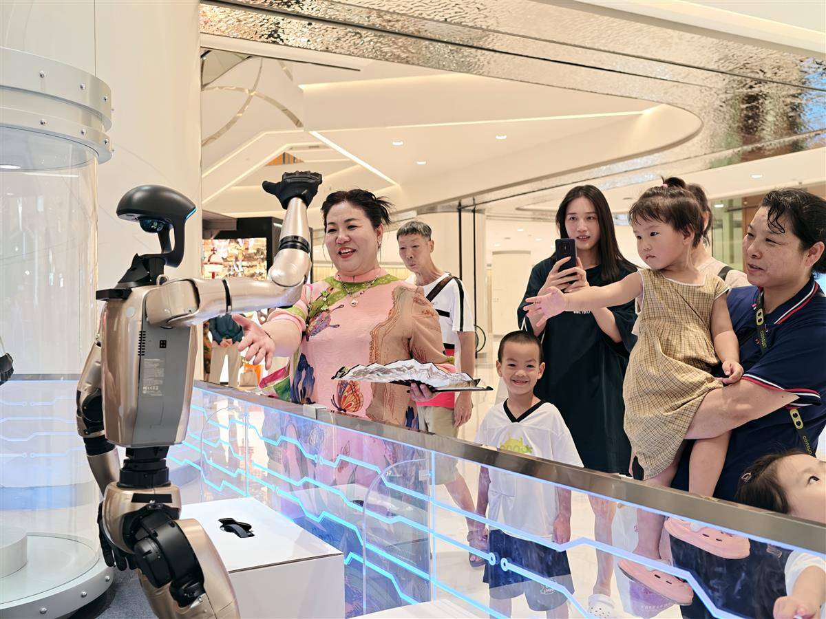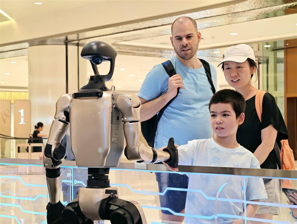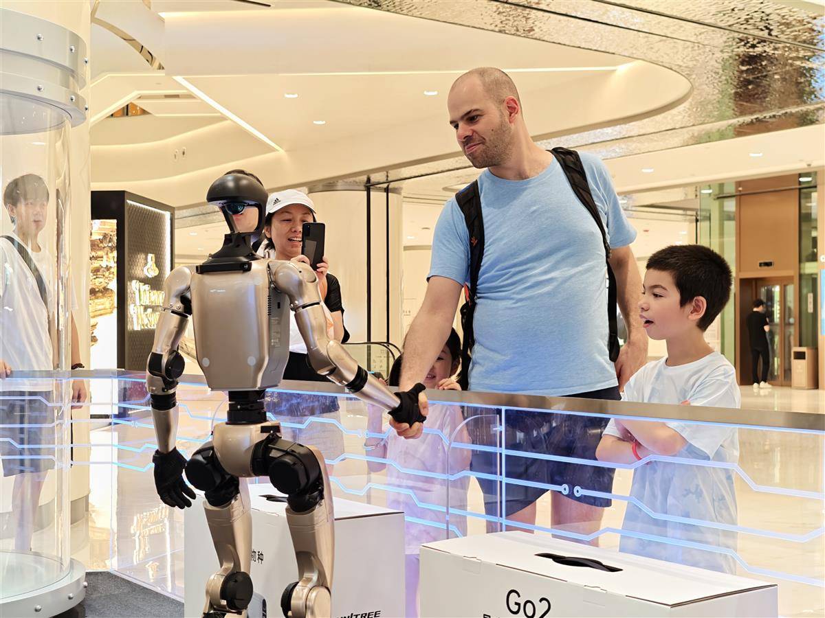 现场市民纷纷伸出好奇之手,争相与机器人“握手”,体验未来科技的独特“礼遇”。
