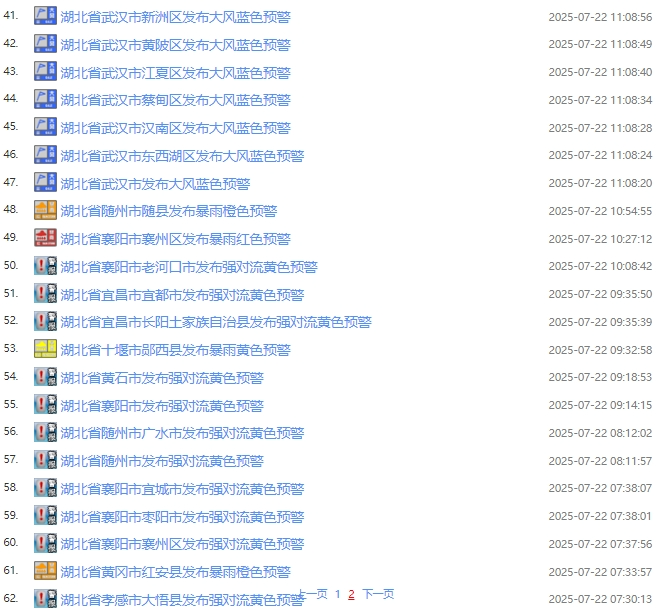 7月22日8时至23日8时,预计三峡库区(兴山县东部和南部、秭归县东部、夷陵区),神农架林区中部和东部、十堰(张湾区、茅箭区、武当山特区、十堰经济技术开发区、郧阳区西南部和中部、竹溪县中部、竹山县中部、房县大部、丹江口市中部和东南部)、襄阳(谷城县中部和南部、保康县西部和中部、南漳县北部、宜城市西南部)、宜昌(西陵区、点军区、猇亭区、伍家岗区、远安县、当阳市、枝江市西南部、宜都市、长阳土家族自治县西部和东北部)、恩施(巴东县南部)、荆门(东宝区)、荆州(松滋市)以及其他强降水区域发生崩塌、滑坡、泥石流的风险较高;其中,十堰(丹江口市西南部、房县东北部)、襄阳(谷城县西南部、保康县北部、中部和东部、南漳县中部和南部)、宜昌(长阳土家族自治县中部和南部、五峰土家族自治县、宜都市西部)发生崩塌、滑坡、泥石流风险高。