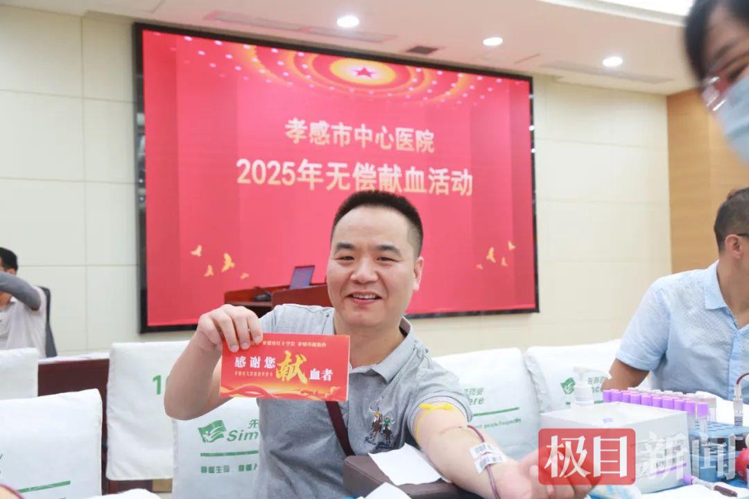 在献血队伍中,孝感市中心医院影像科成厚丕医生格外引人注目,他手持“无偿献血荣誉卡”留了一张影。