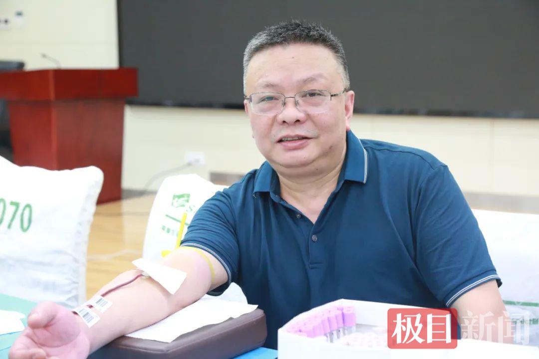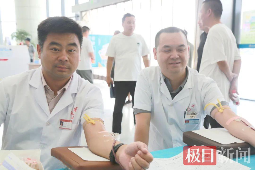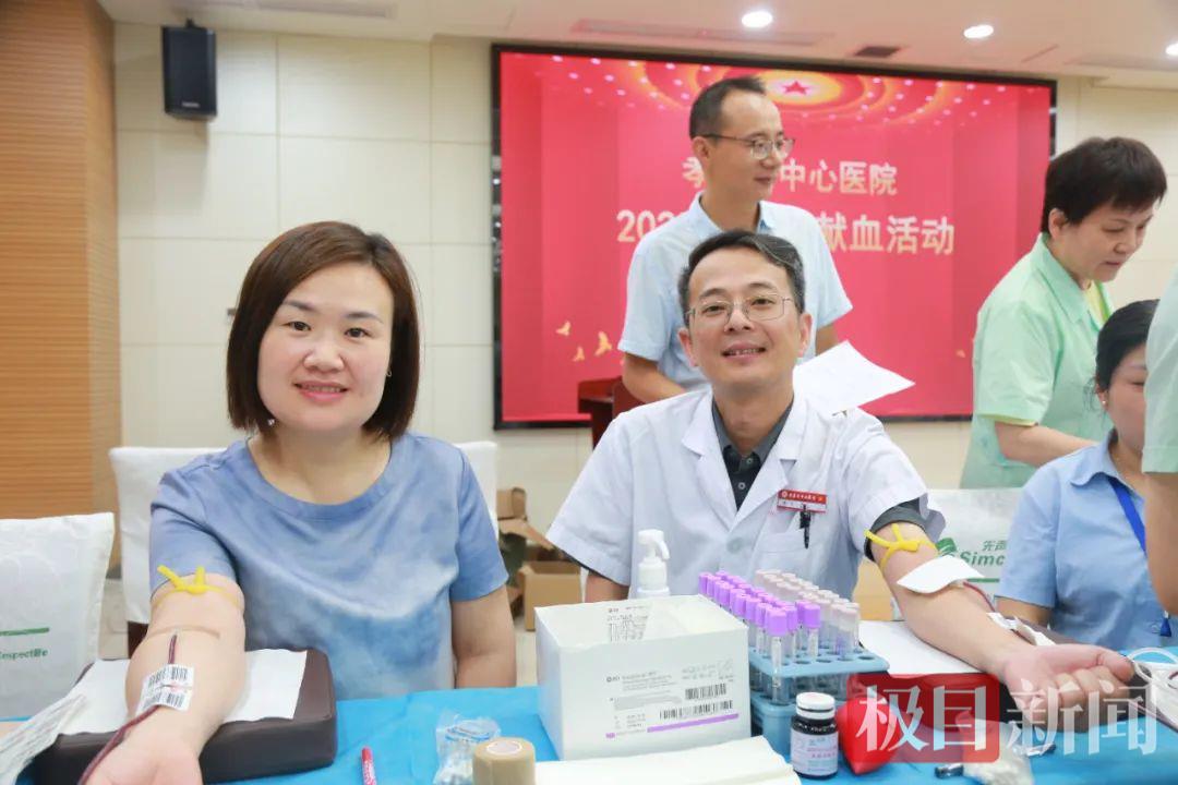 孝感市中心医院输血科主任董亮和妻子一同前来无偿献血。夫妻二人默契地伸出胳膊,鲜红的血液缓缓流入采血袋。