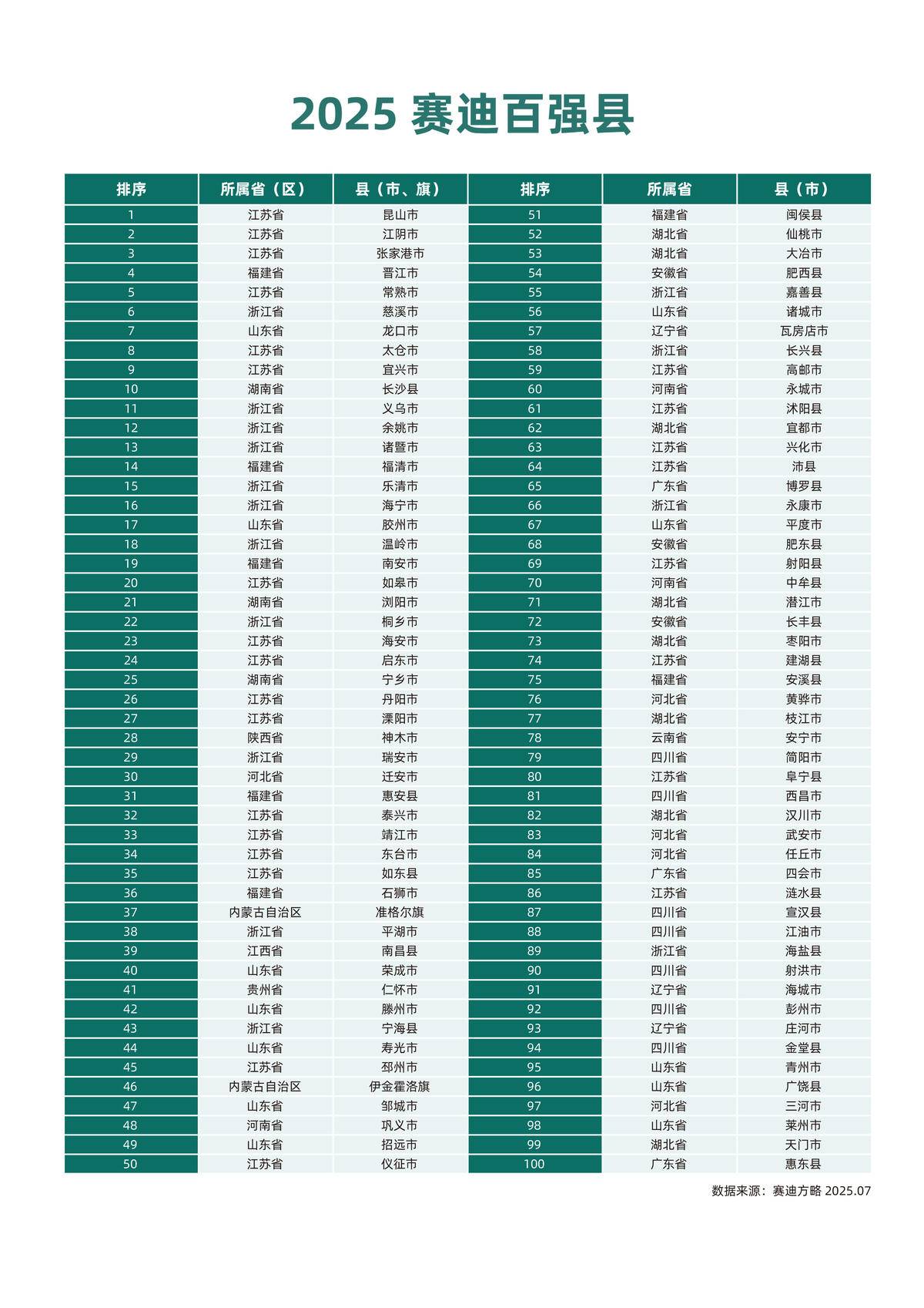 湖北日报讯(记者肖丽琼)7月23日,2025县域经济创新发展论坛在北京举行,赛迪顾问发布2025赛迪百强县市榜单。湖北8地上榜,分别是仙桃(第52位)、大冶(第53位)、宜都(第62位),潜江(第71位),枣阳(第73位),枝江(第77位),汉川(第82位),天门(第99位)。