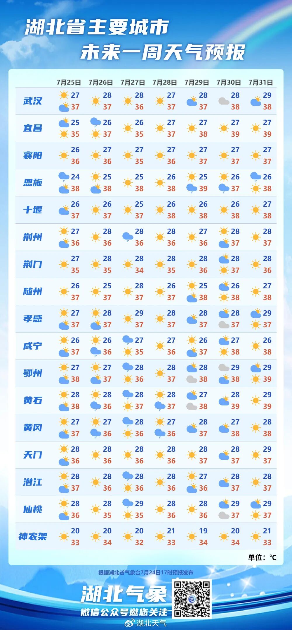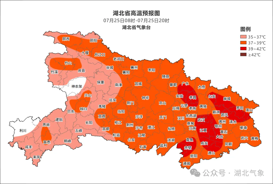 预计7月25日白天,除西部高海拔地区外,我省大部分地区最高气温将升至37℃以上,其中随州、孝感、武汉、鄂州、黄石、黄冈、咸宁局地可达39℃以上,请注意防范。