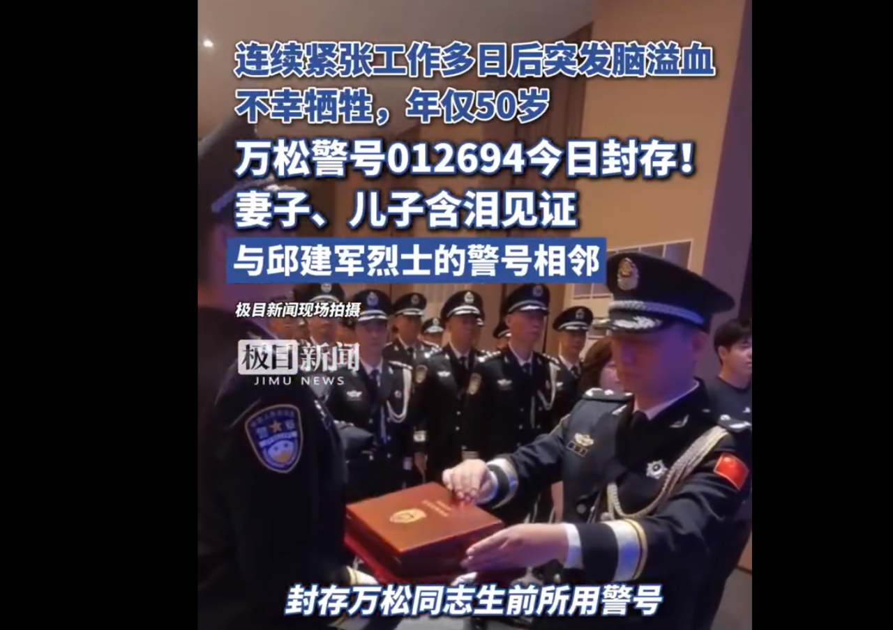 7月25日上午,武汉市公安局在党建中心举行仪式,万松警号012694正式封存,与邱建军烈士的警号相邻。5月26日,万松被同事发现在办公室内昏迷不醒。5月27日凌晨,经抢救无效不幸因公牺牲,年仅50岁。