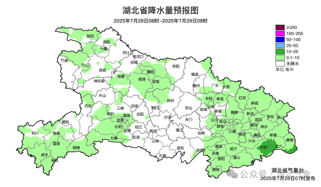 7月26日08时-27日08时,鄂西南东部、江汉平原南部、鄂东北东部、鄂东南多云有分散性雷阵雨,局地大雨或暴雨,并伴有雷暴大风等强对流天气;其他地区晴天到多云,局地有雷阵雨。最高气温34~39℃,最低气温西部23~27℃、中东部27~28℃,偏北风3级、阵风4到6级。