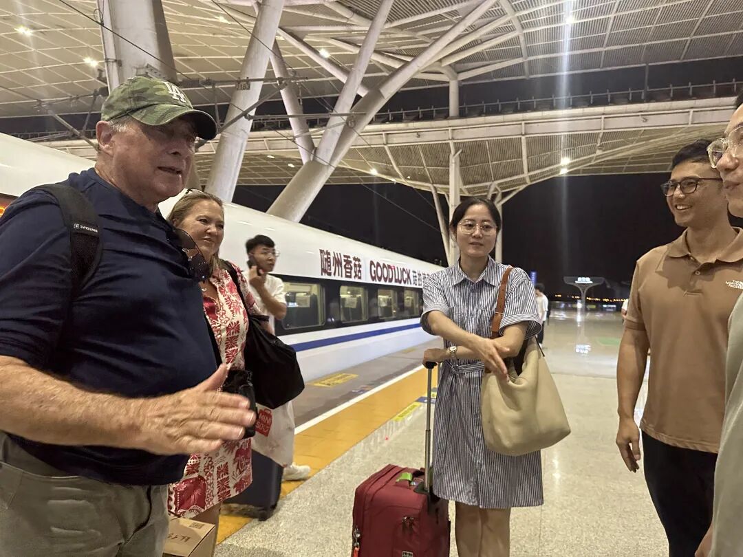 7月26日晚,美中航空遗产基金会主席杰夫·格林、飞虎队老兵后代安娜·安东尼娅·李一行乘高铁抵达武汉。