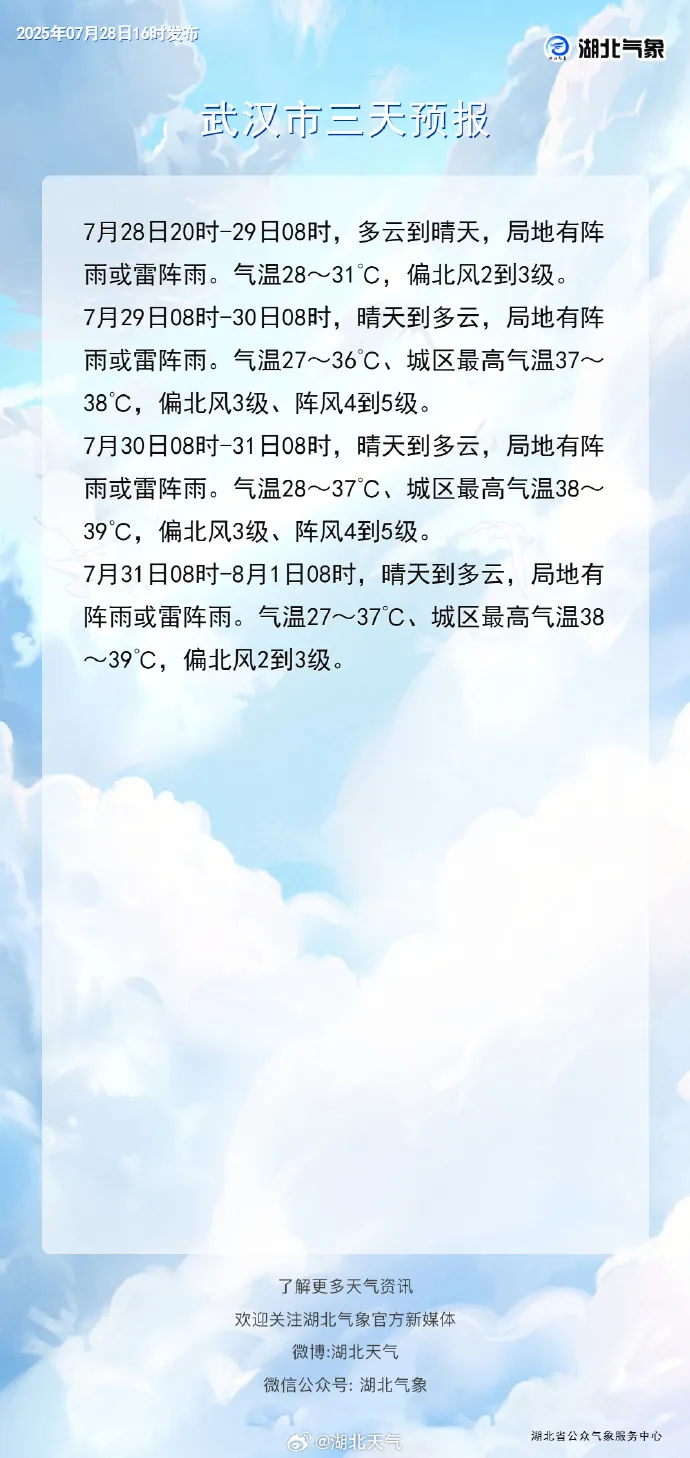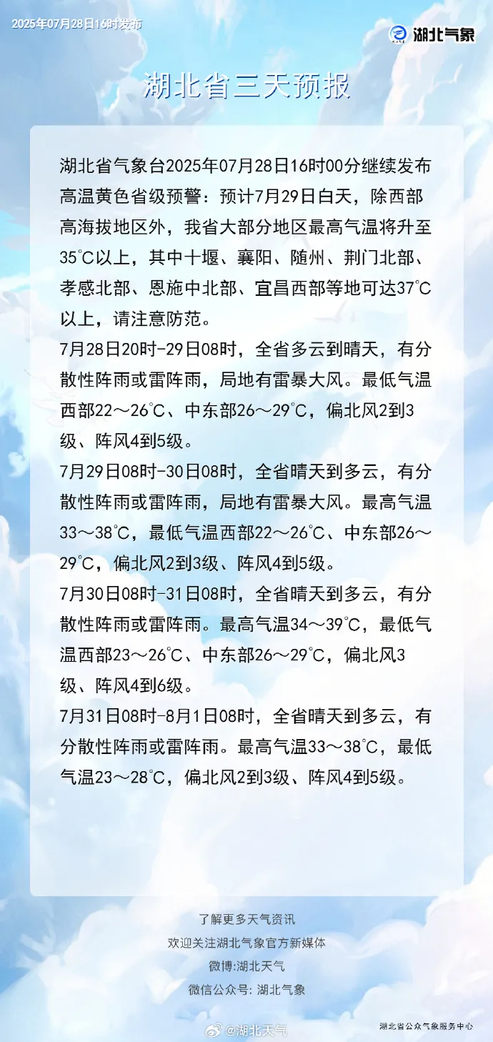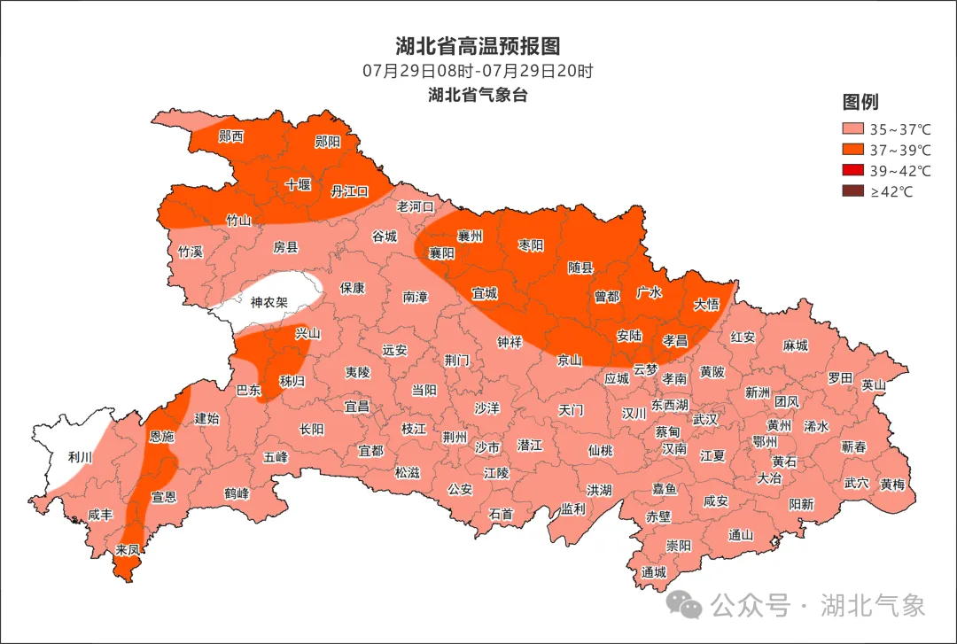 预计7月29日白天,除西部高海拔地区外,我省大部分地区最高气温将升至35℃以上,其中十堰、襄阳、随州、荆门北部、孝感北部、恩施中北部、宜昌西部等地可达37℃以上,请注意防范。
