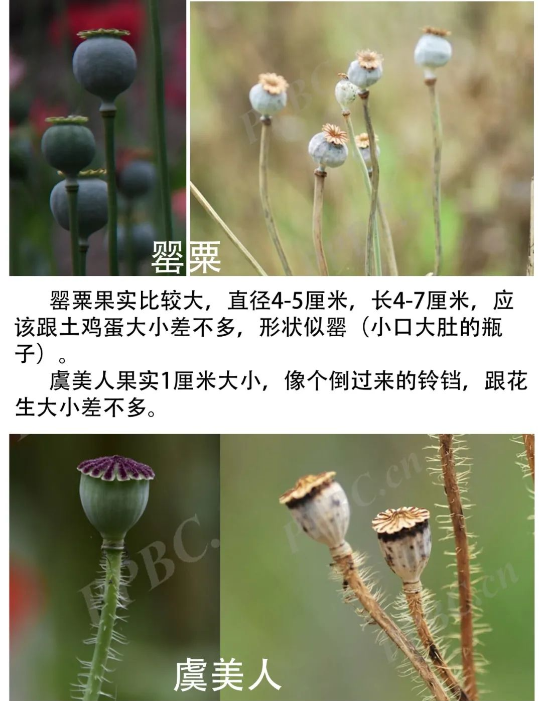 虞美人:果实较小,长约1厘米,呈宽倒卵形,有绒毛,通常下垂。