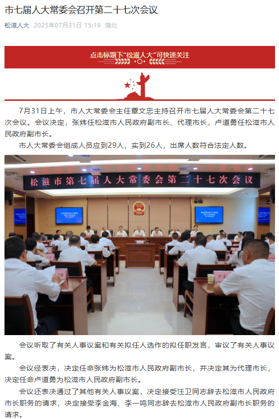 会议经表决,决定任命张炜为松滋市人民政府副市长,并决定其为代理市长,决定任命卢道勇为松滋市人民政府副市长。