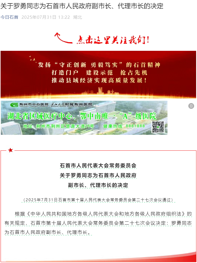 据“今日石首”报道,7月31日石首市人民代表大会常务委员会第二十七次会议通过关于罗勇同志为石首市人民政府副市长、代理市长的决定。