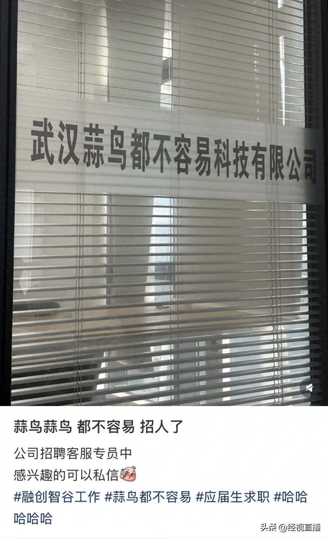 8月7日,经视直播记者以求职者身份联系上武汉蒜鸟都不容易科技有限公司。工作人员表示,他们是一家位于武汉市洪山区融创智谷的初创企业,称公司名字是“随意选取的”。工作人员介绍,目前公司正在招聘电话客服专员和市场经理,客服岗位主要负责电话确认客户意向并转交市场部跟进。对于招聘要求,工作人员称,该岗位要求高中以上学历,实行8小时工作制,周末单双轮休,试用期薪资为4034元底薪加奖金。