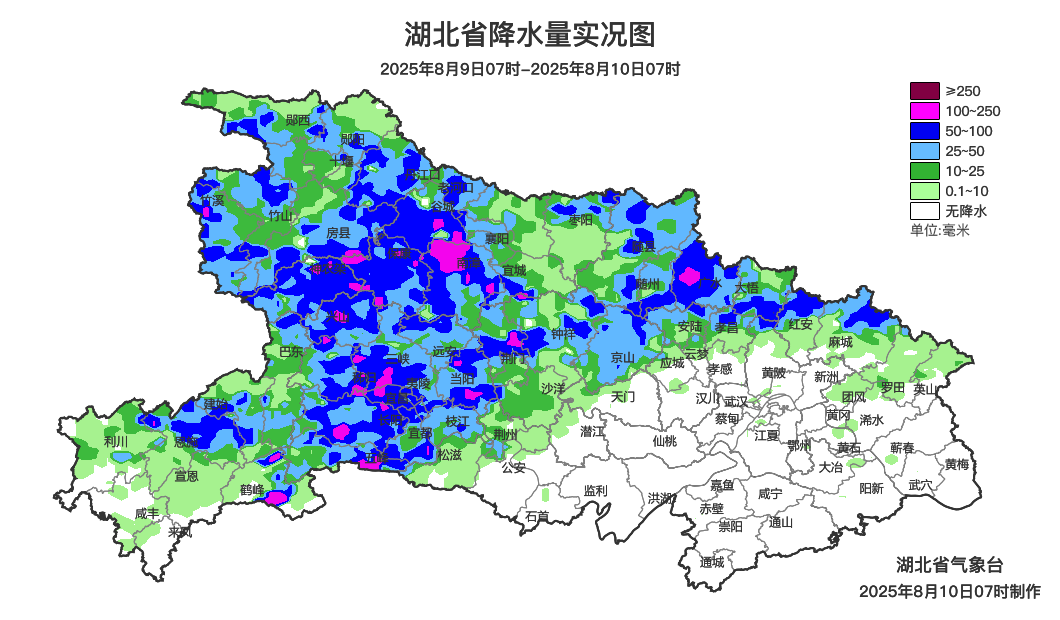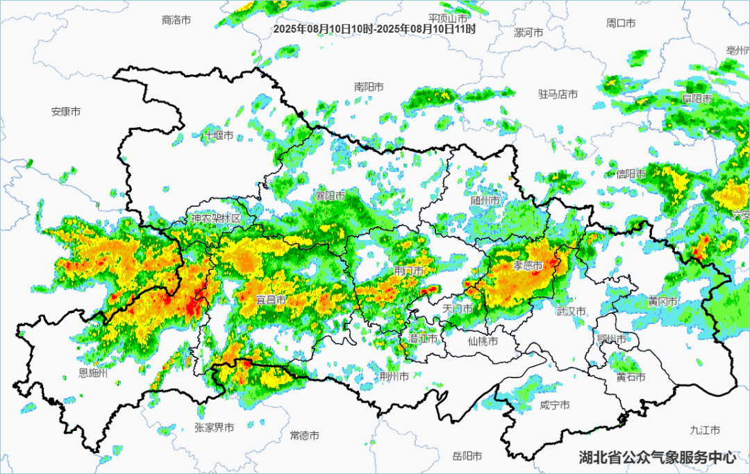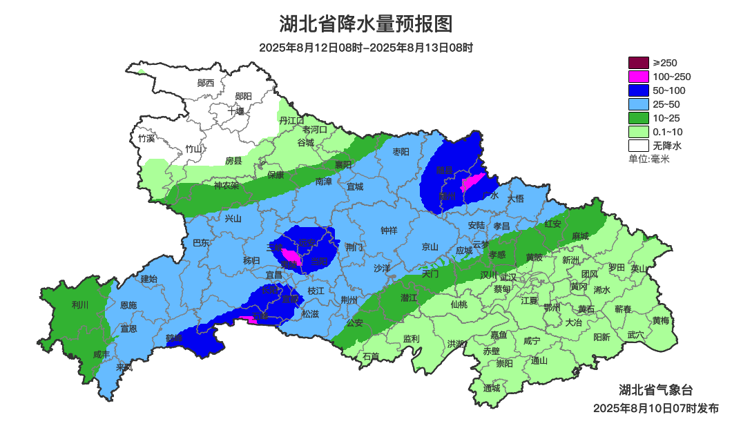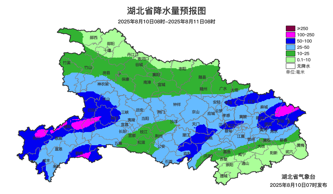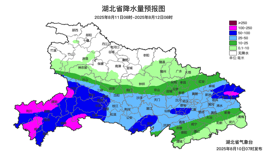 8月10日08时-11日08时,鄂西北南部、鄂西南、江汉平原、鄂东北阴天有大雨到暴雨,局地大暴雨;其他地区阴天有小到中雨。省内部分地区伴有短时强降水、雷暴大风等强对流天气。最高气温鄂东南32~36℃、其他地区24~31℃,最低气温21~25℃,偏北风2到3级、阵风4到5级。8月11日08时-12日08时,鄂西南、江汉平原、鄂东北东部阴天有大雨到暴雨,局地大暴雨;鄂西北阴天到多云;其他地区阴天有小到中雨。省内部分地区伴有短时强降水、雷暴大风等强对流天气。最高气温鄂西北北部28~33℃,其他地区24~28℃,最低气温21~25℃,偏北风2到3级、阵风4级。8月12日08时-13日08时,鄂西北东部、鄂西南、江汉平原北部、鄂东北西部阴天有大雨到暴雨,局地大暴雨;其他地区阴天有阵雨或雷阵雨。省内部分地区伴有短时强降水、雷暴大风等强对流天气。最高气温鄂西北29~33℃,其他地区24~30℃,最低气温21~25℃,偏北风2到3级、阵风4级。预报来源:湖北省气象台2025年8月10日08时预报