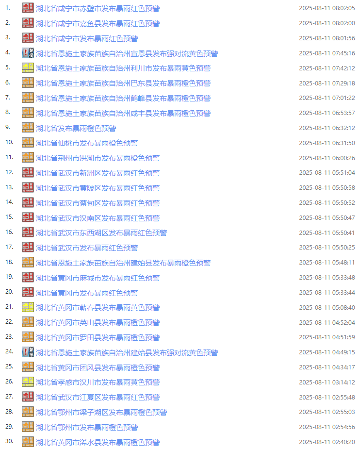 湖北省水利厅和湖北省气象局 2025 年 08 月 10 日 20 时联合发布红色山洪灾害气象预警。预计 2025 年 08 月 10 日 20 时至 08 月 11 日 20 时,下列地区存在山洪灾害风险: