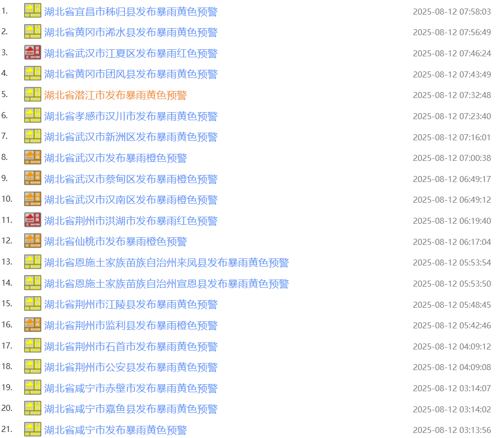 湖北早晨连发21条预警信息