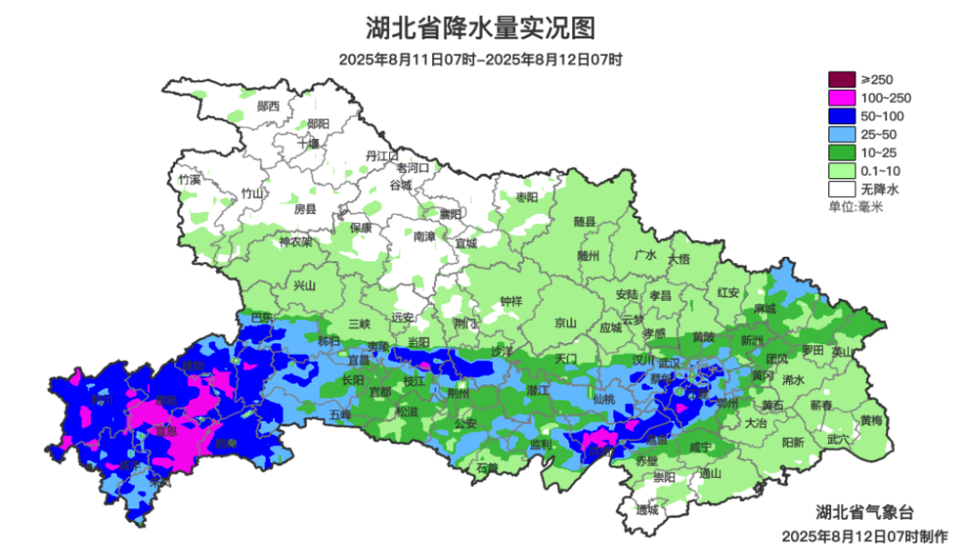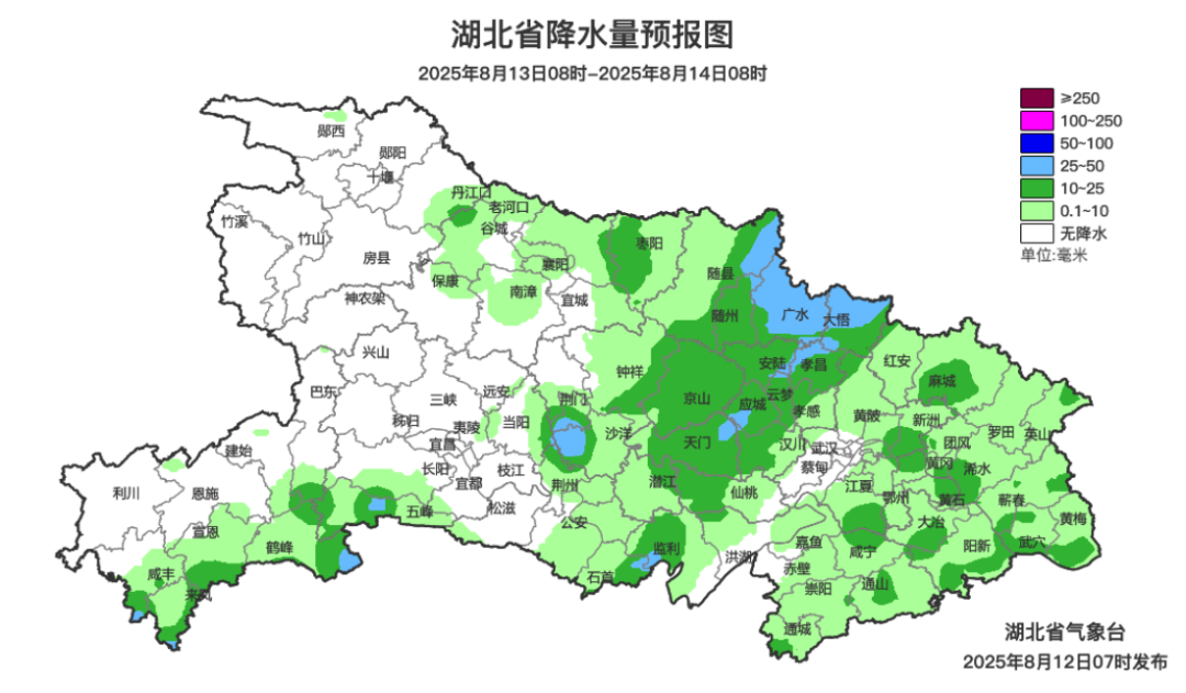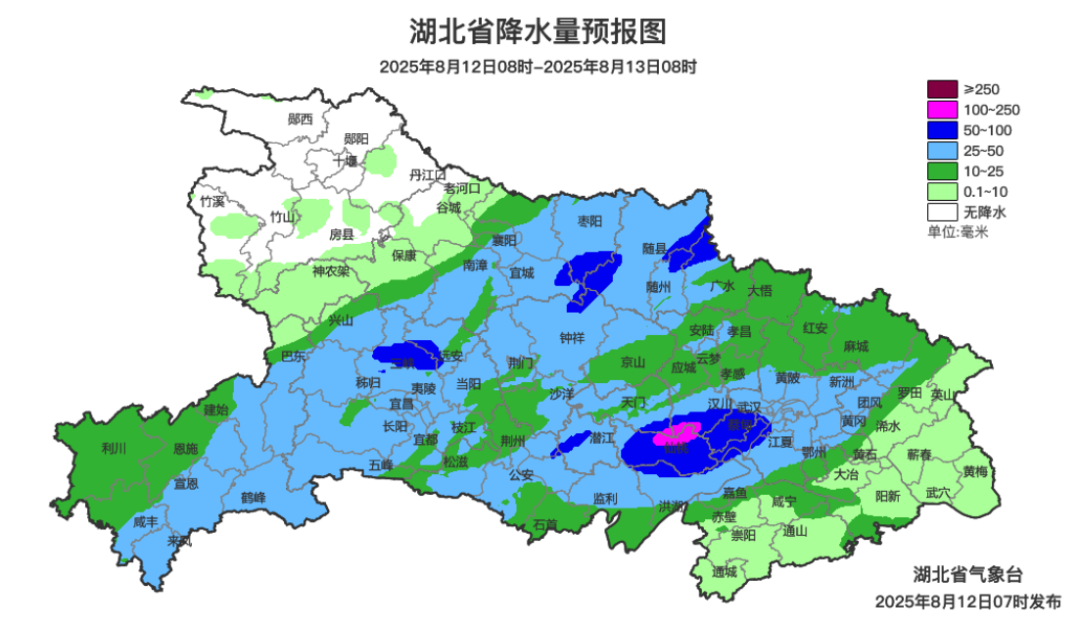 8月12日08时-13日08时,江汉平原、鄂东北阴天有大雨到暴雨,局地大暴雨;鄂西南、鄂西北东部阴天有中到大雨,局地暴雨;其他地区阴天有阵雨。省内局地伴有雷暴大风。最高气温十堰、鄂东南30~33℃,其他地区24~30℃,最低气温21~25℃,偏北风2到3级。