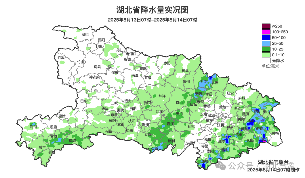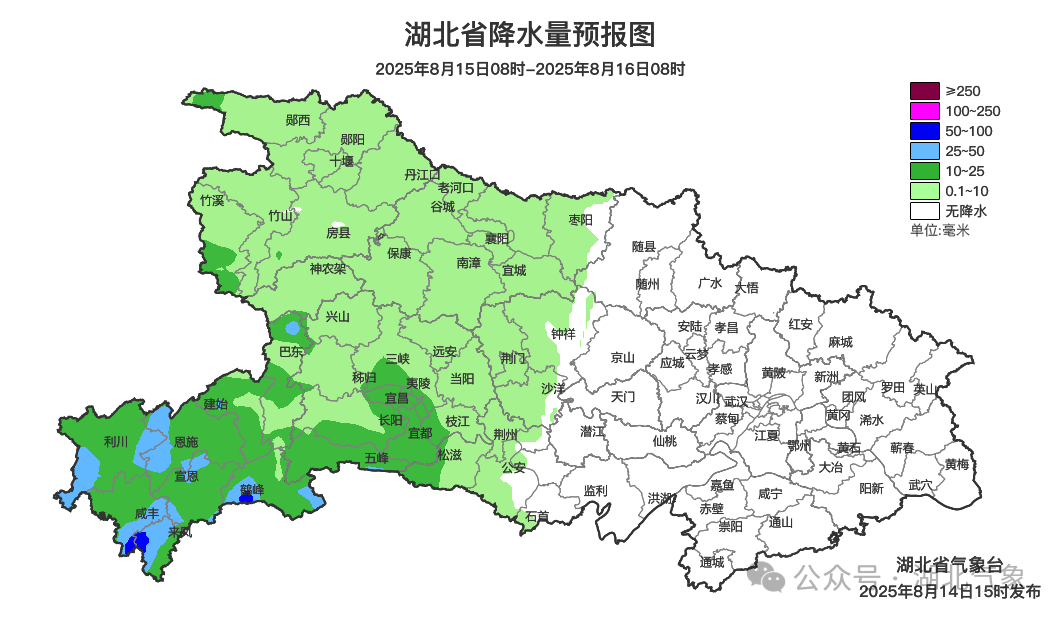 8月15日08时-16日08时,鄂西北、鄂西南、江汉平原西部多云有阵雨或雷阵雨,其中鄂西南局地有大雨或暴雨;其它地区多云到晴天。最高气温西部29~33℃、中东部33~38℃,最低气温23~27℃,偏东风2到3级、阵风4到6级。
