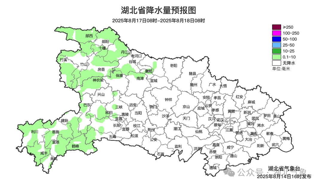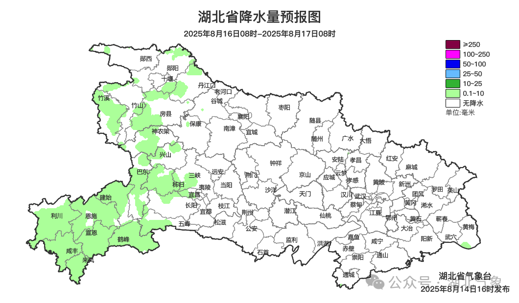 温馨提醒:明天鄂西南局地有大雨或暴雨,公众需留意当地的预警预报信息,防范局地强降雨可能引发的城市内涝或山洪、滑坡等次生灾害。16日起我省晴热高温天气将进一步发展,公众需注意防暑降温。