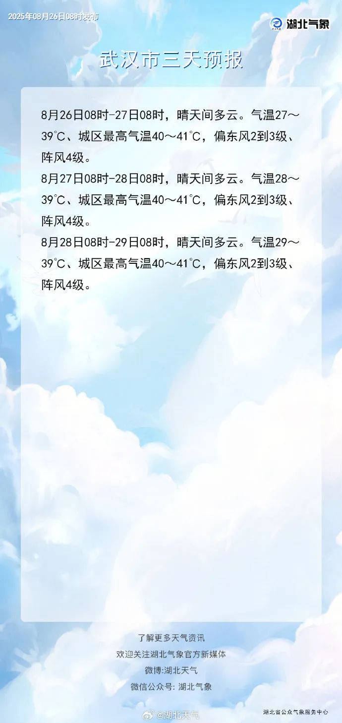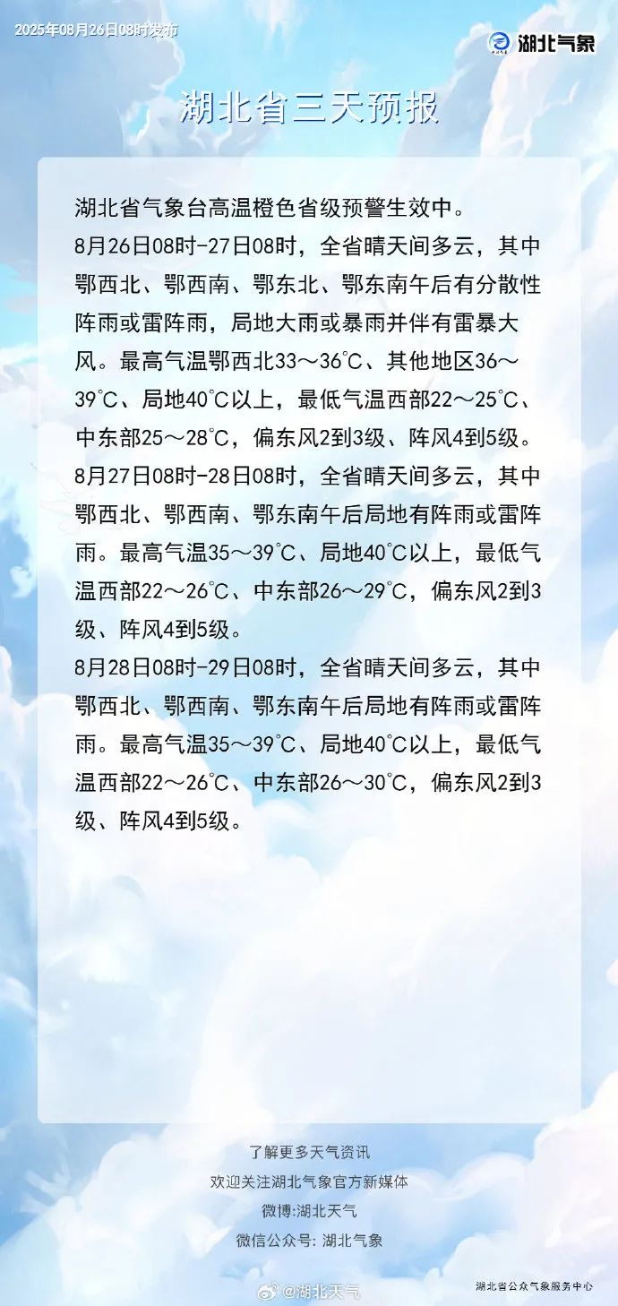 未来三天湖北全省以晴天间多云为主,省内部分地区午后有分散性阵雨或雷阵雨。湖北省气象台高温橙色省级预警生效中,预计今天白天除鄂西山区外,我省大部分地区最高气温将升至35℃以上,其中襄阳东部、宜昌、江汉平原及鄂东等地可达37℃以上,局地达39℃以上。明后天暑热持续,大部地区最高气温35~39℃,局地可达40℃。